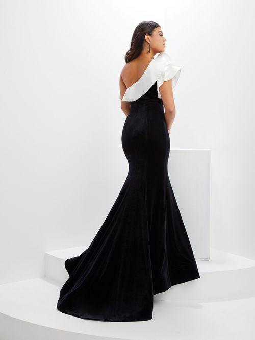 Simple and beautiful, this gown in stretch velvet has a fitted body and trumpet skirt with train and features a satin ruffle neckline and rose ruffle shoulder detail.