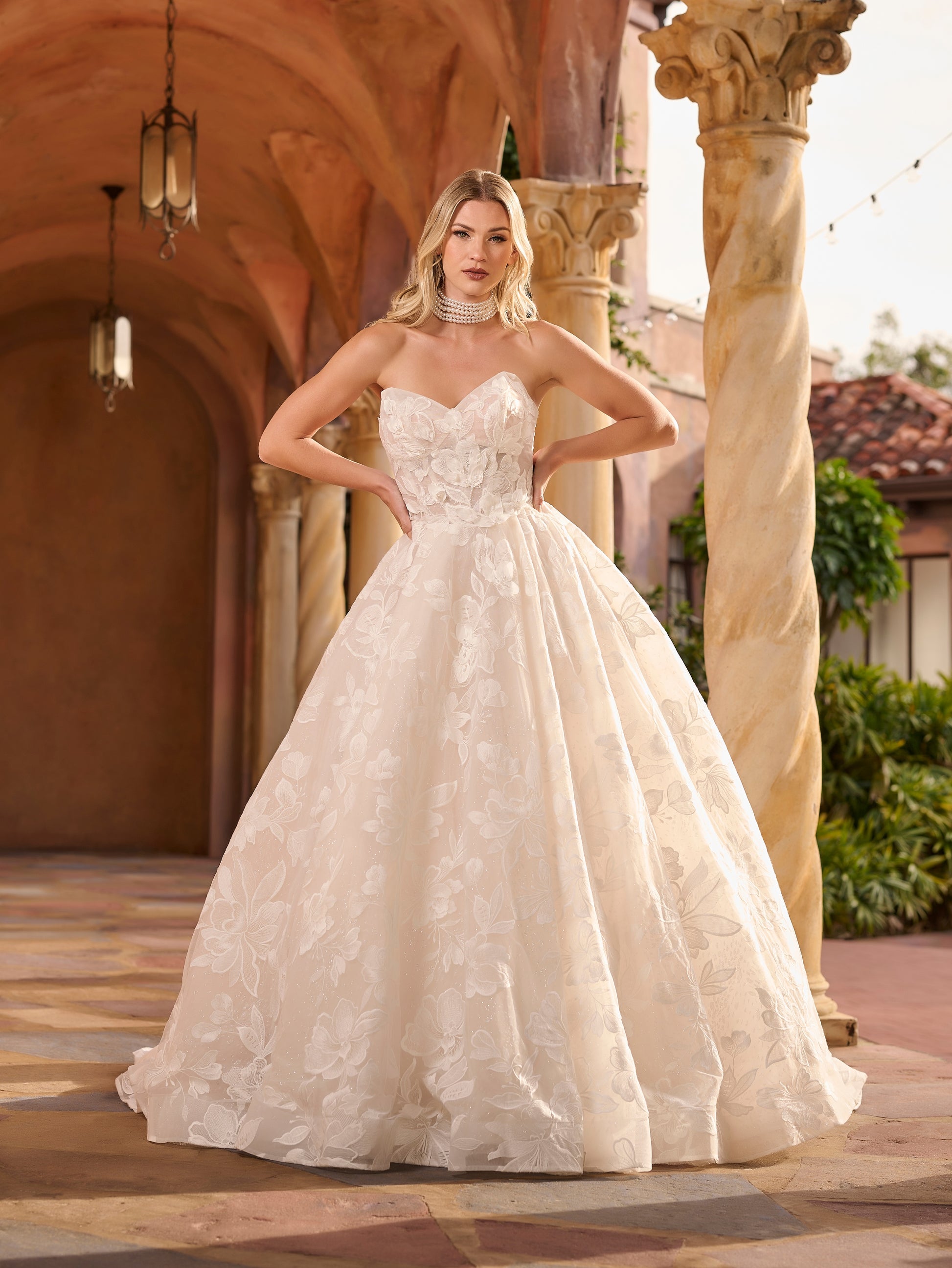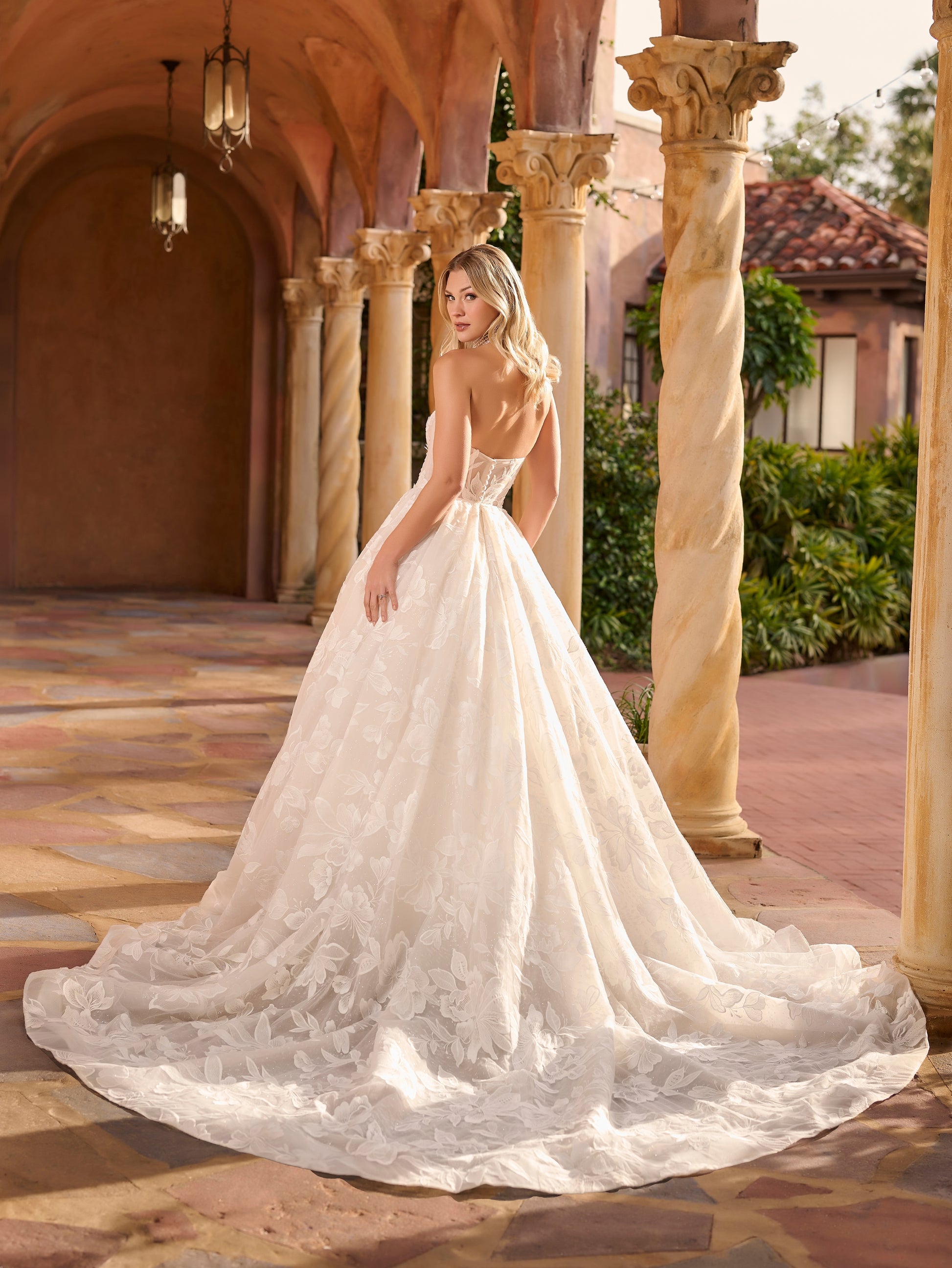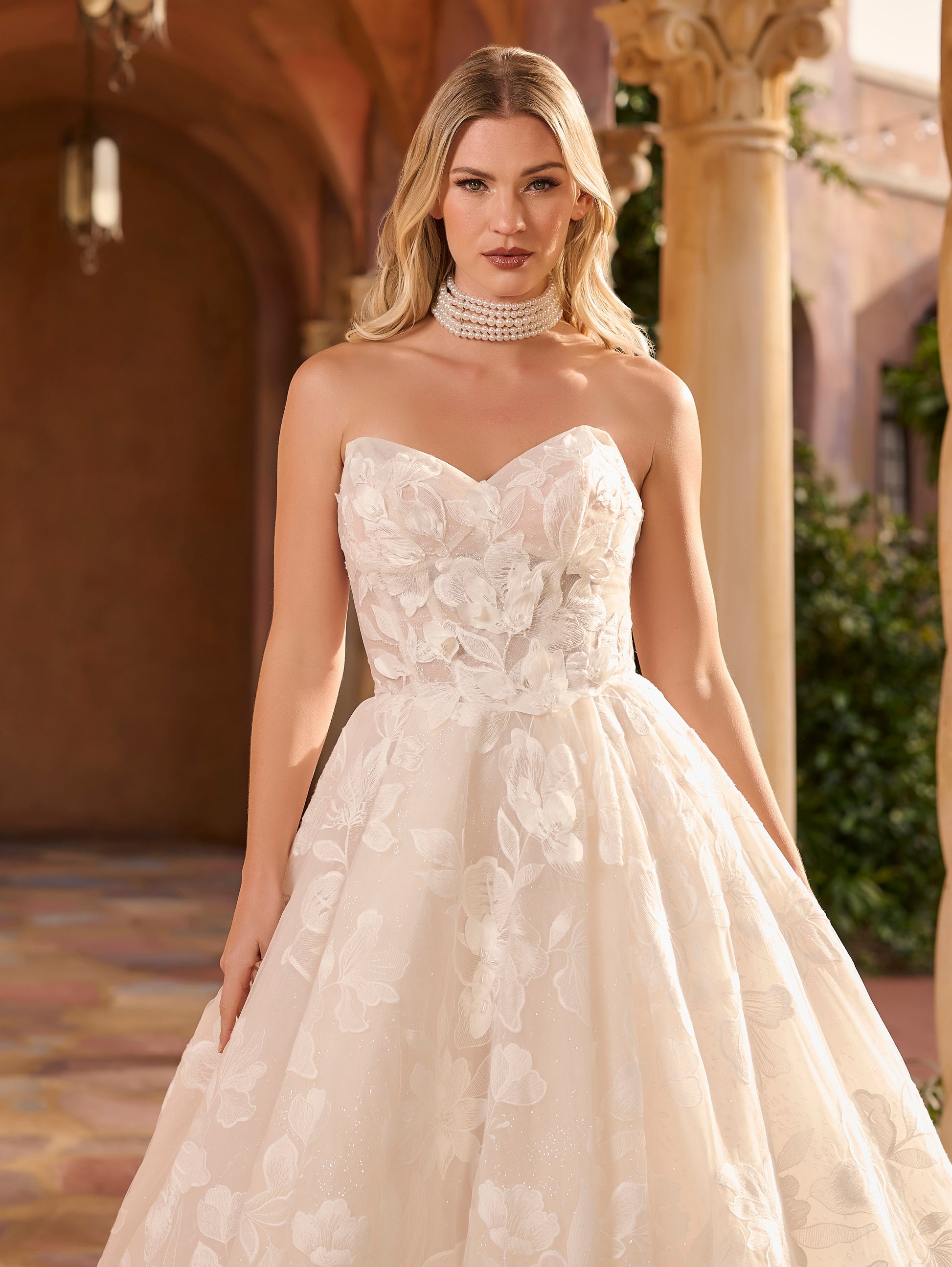 This elegant full A-line ballgown features a lace design with a romantic sweetheart neckline. The semi-sheer bodice is adorned with intricate 3D motifs and delicate beading. The back is detailed with covered buttons and elastic loops along the zipper closure for a refined finish.