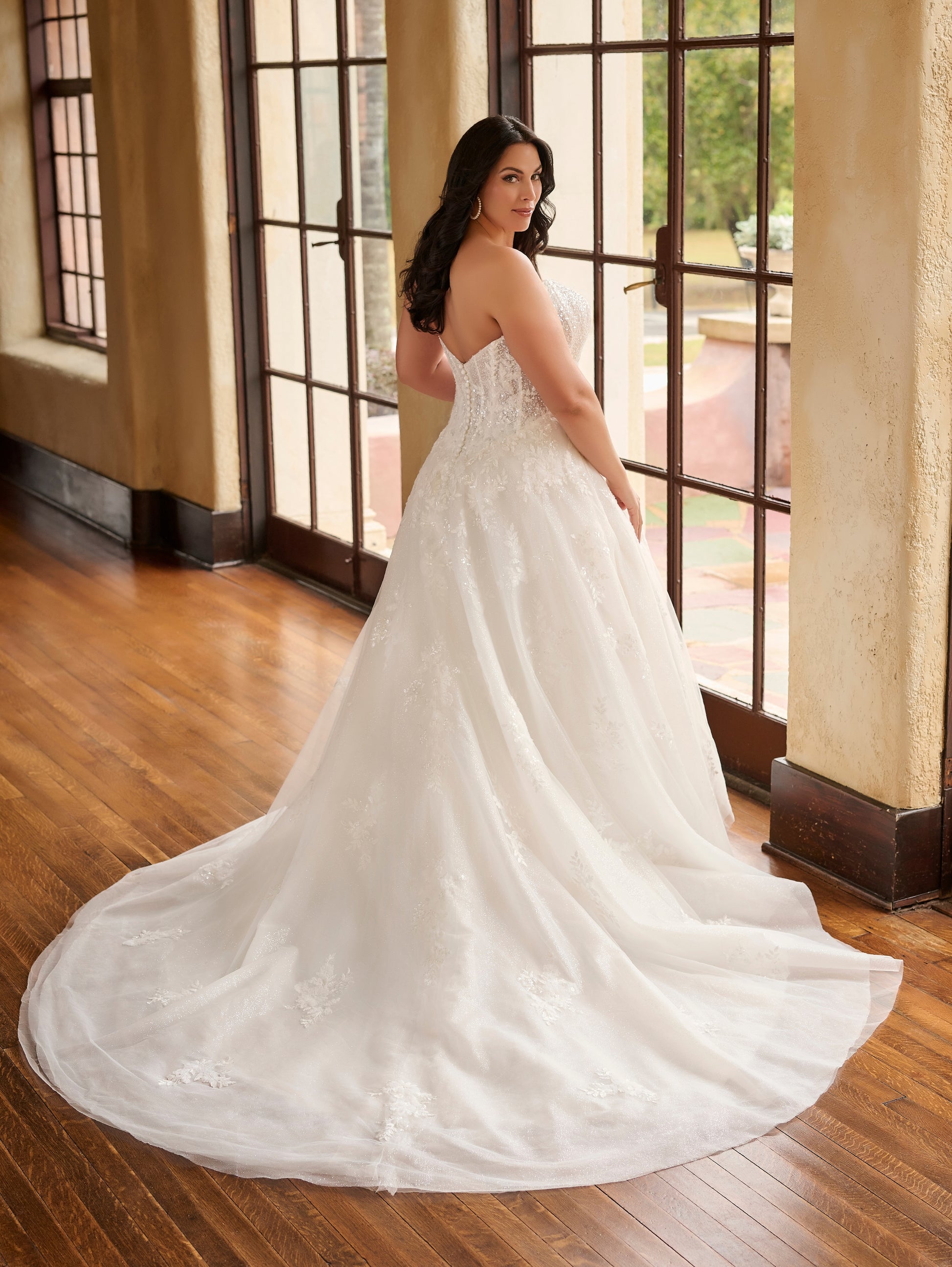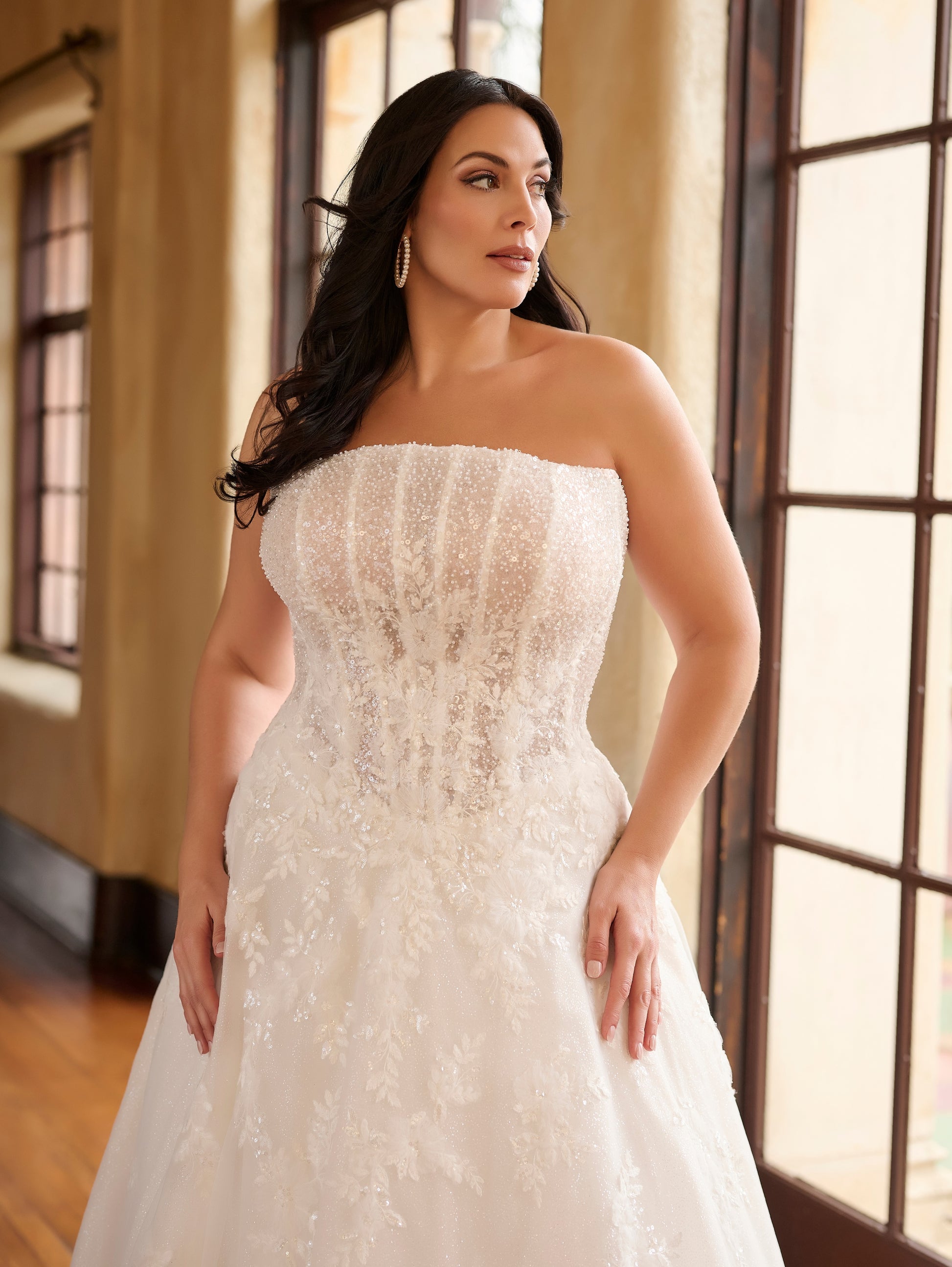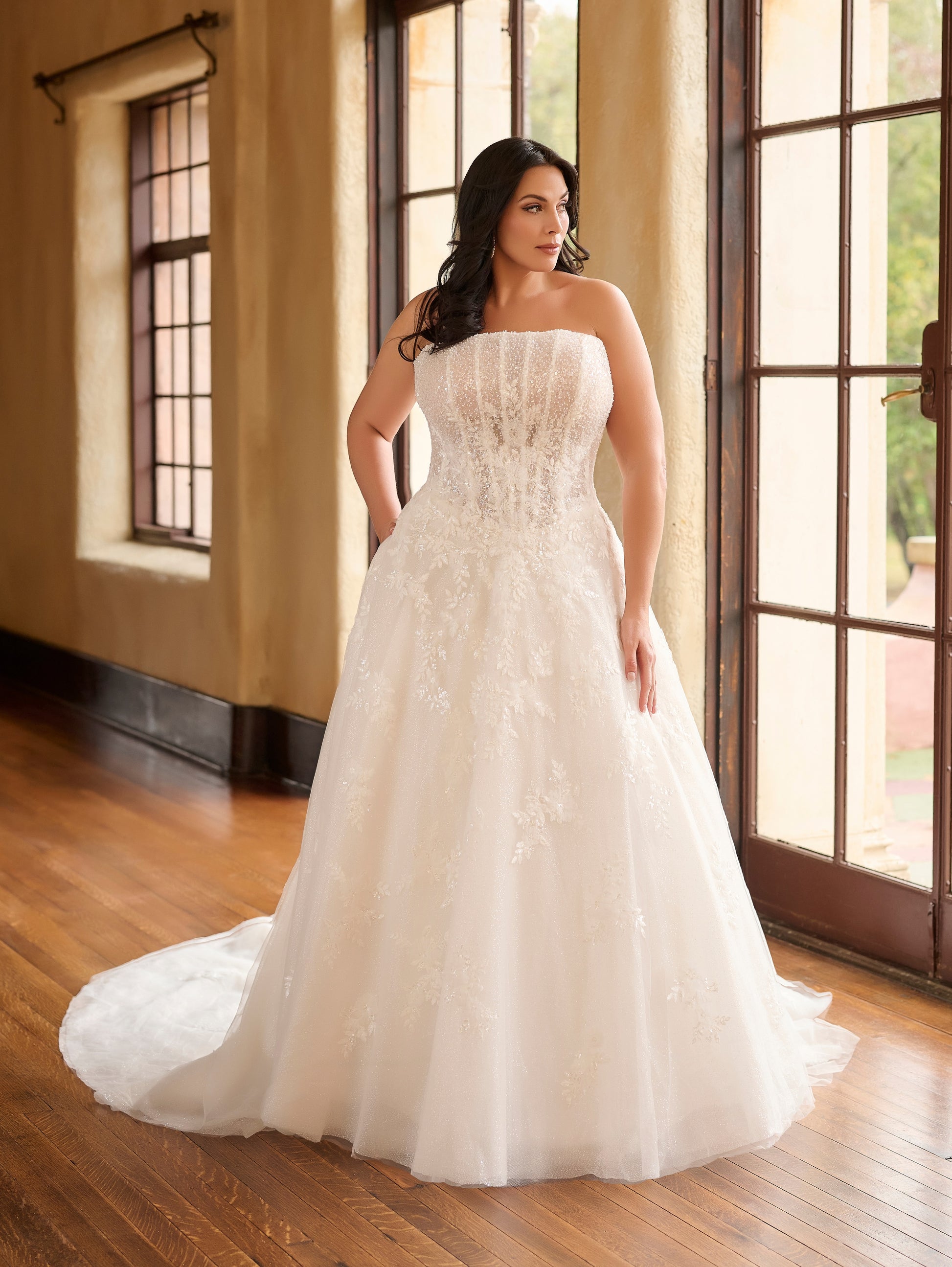 This sophisticated A-line gown features a semi-sheer bodice with exposed boning and a straight neckline that gently curves. The beaded bodice flows into a tulle skirt layered over a shimmering underlay adorned with textured lace motifs. The back is elegantly finished with covered buttons and elastic loops along the zipper closure. Part of the Plus Size/Curvy Collection, it is designed to flatter and celebrate fuller figures.