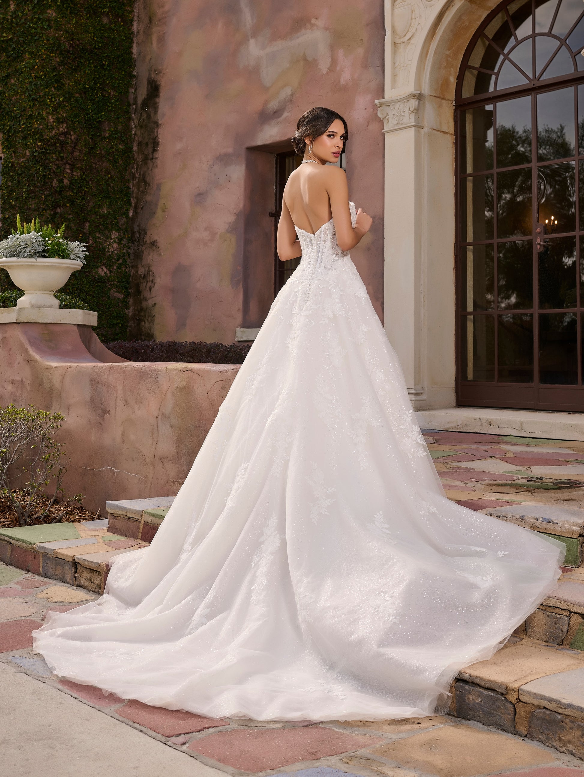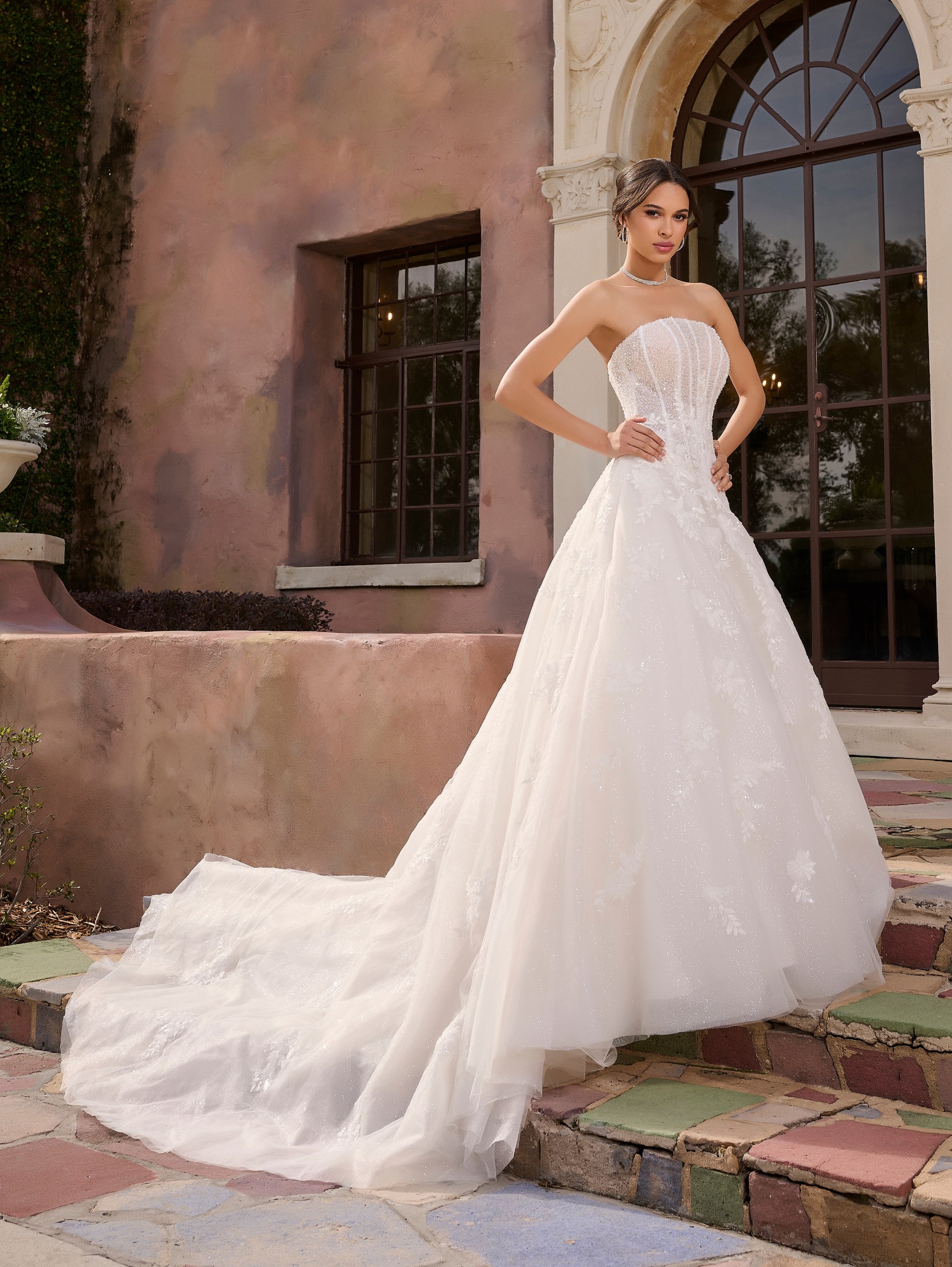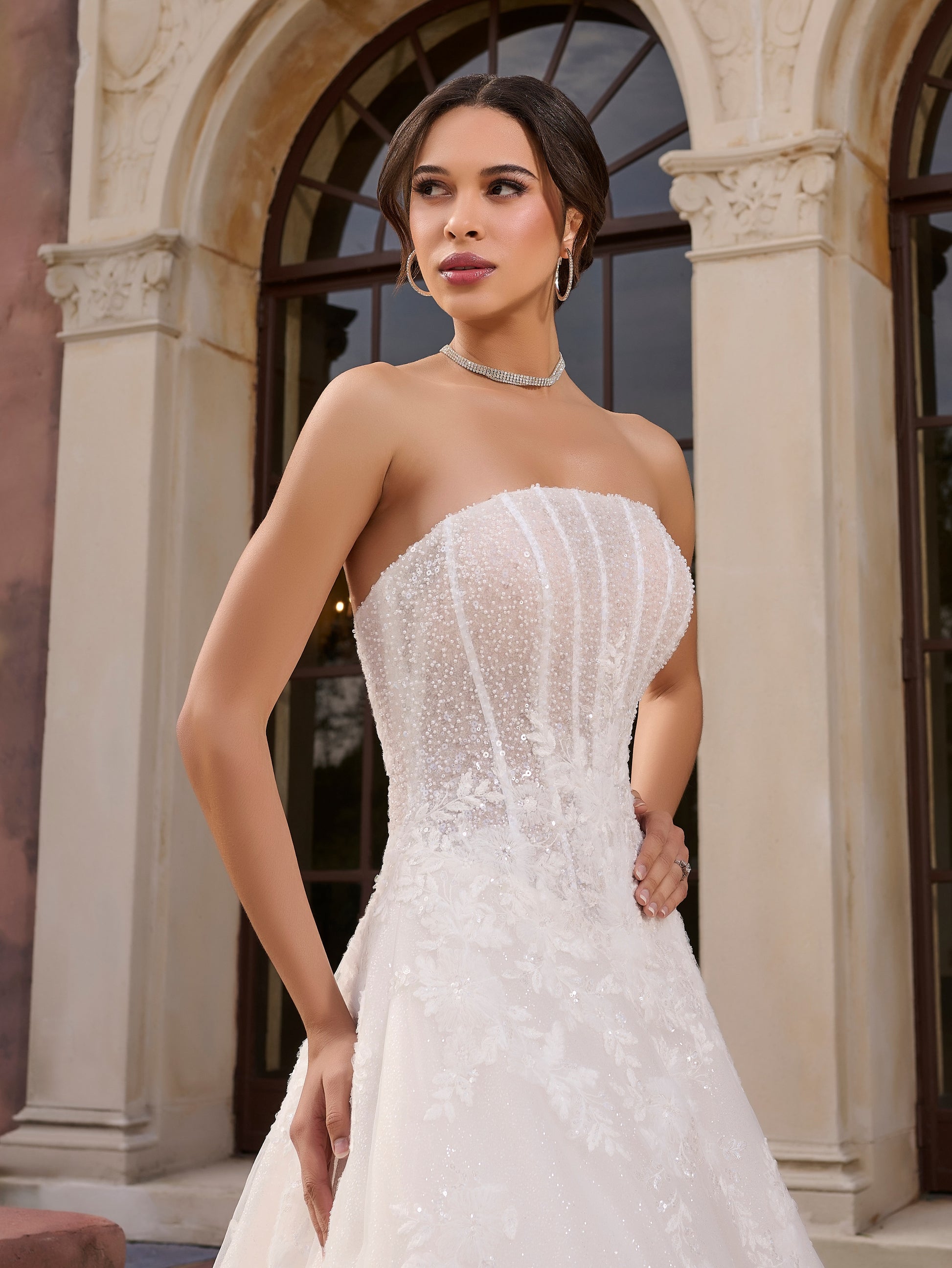 This sophisticated A-line gown features a semi-sheer bodice with exposed boning and a straight neckline that gently curves. The beaded bodice flows into a tulle skirt layered over a shimmering underlay adorned with textured lace motifs. The back is elegantly finished with covered buttons and elastic loops along the zipper closure. Part of the Plus Size/Curvy Collection, it is designed to flatter and celebrate fuller figures.