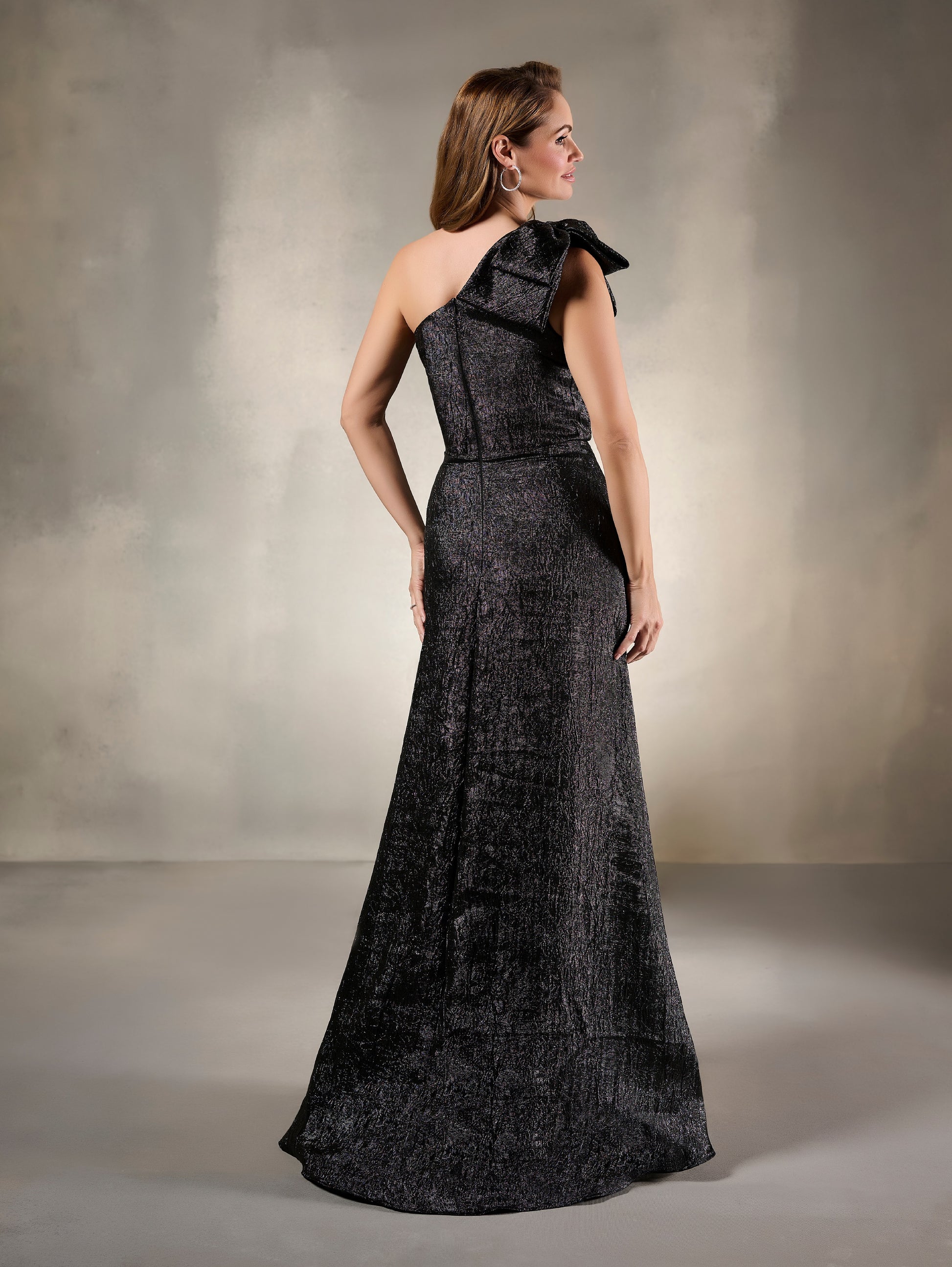 This elegant one-shoulder metallic brocade gown showcases a beautifully pleated bodice that enhances the silhouette with refined texture and depth. The wrap skirt flows gracefully, adding movement and a flattering shape that complements the sophisticated design. Perfect for formal occasions, this gown combines luxurious fabric with a timeless cut to create a striking and memorable look.