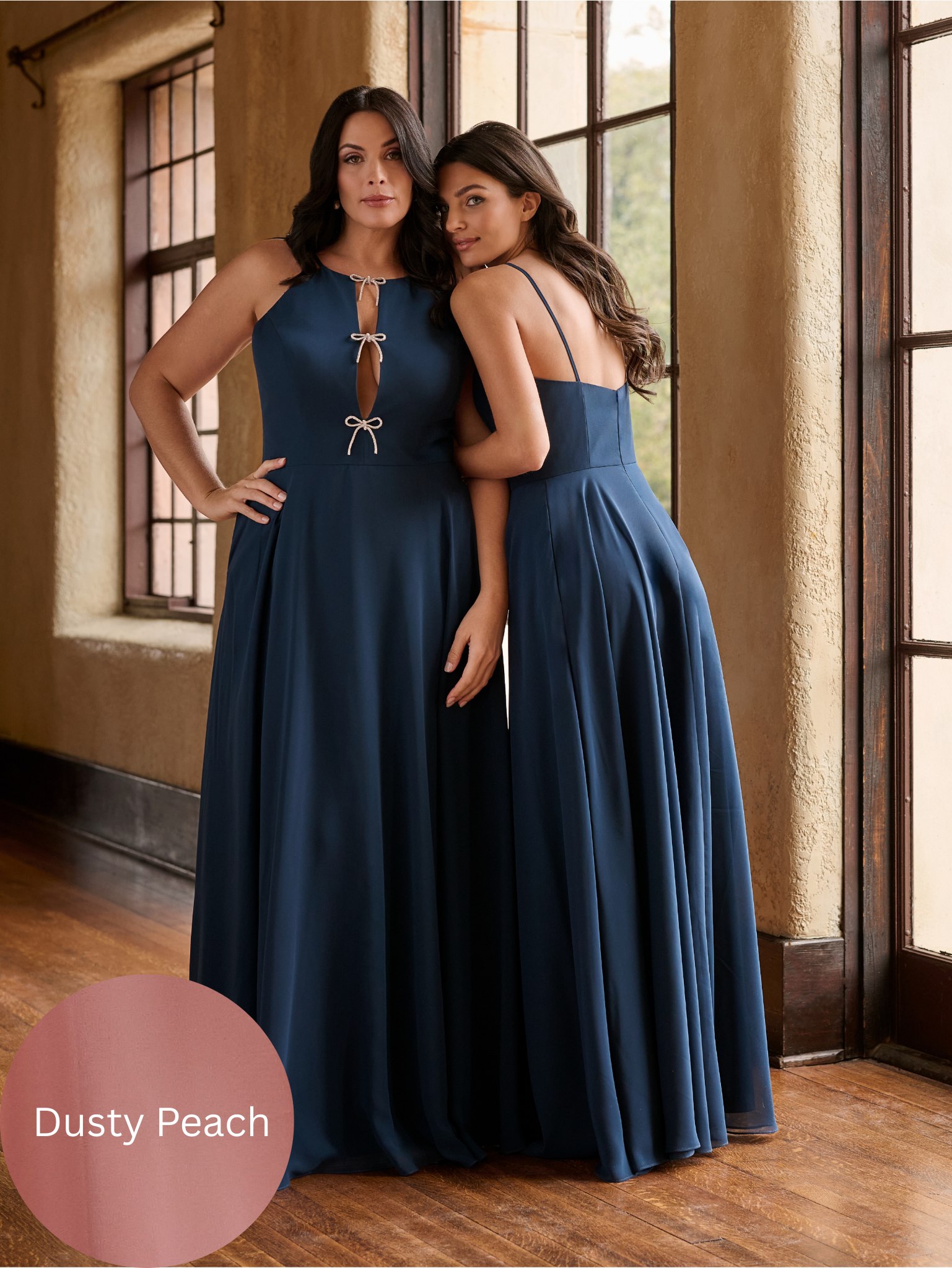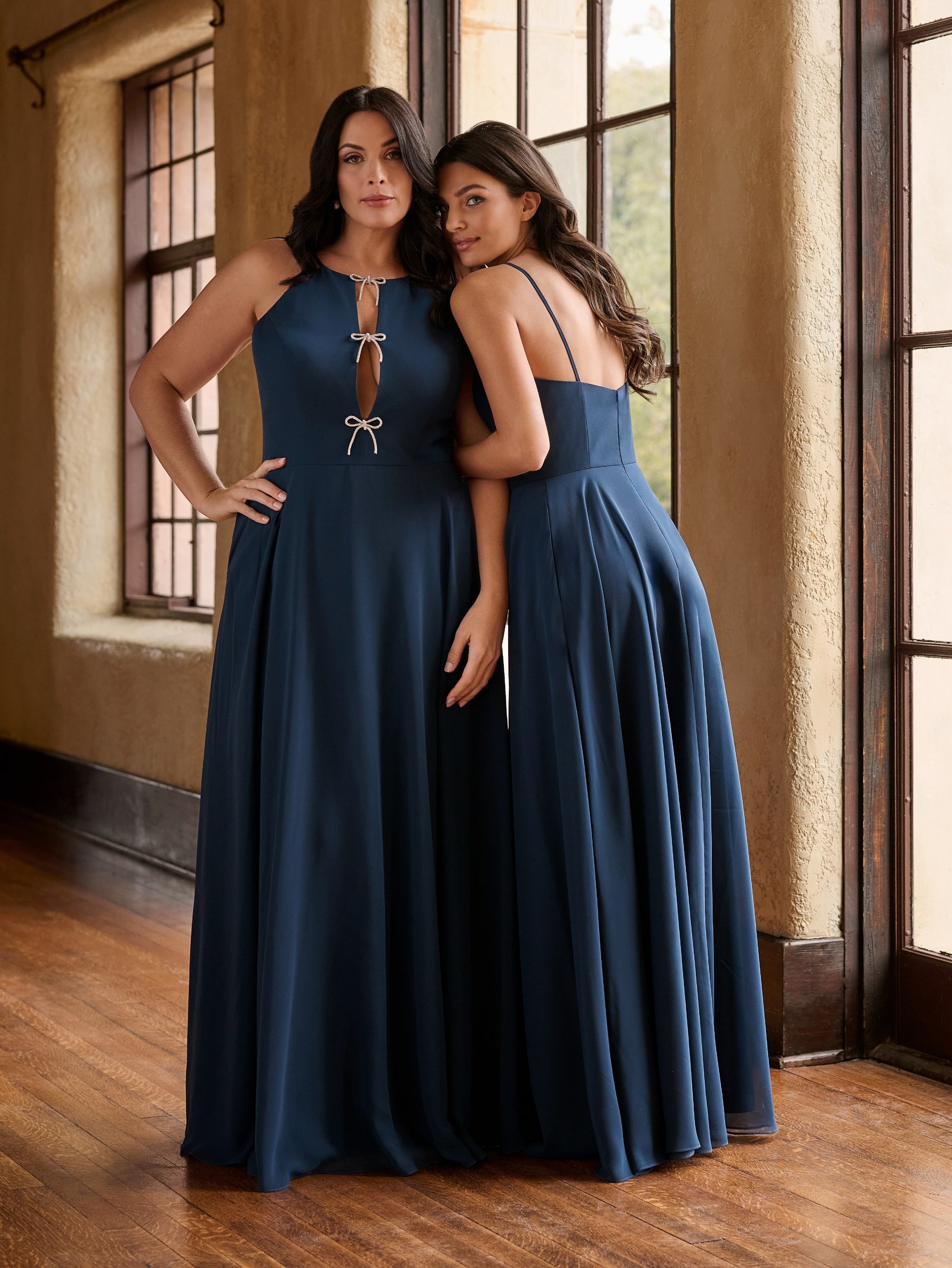 This elegant chiffon A-line dress features a halter neckline, a keyhole detail, and delicate crystal-accented roping bows for a refined finish.