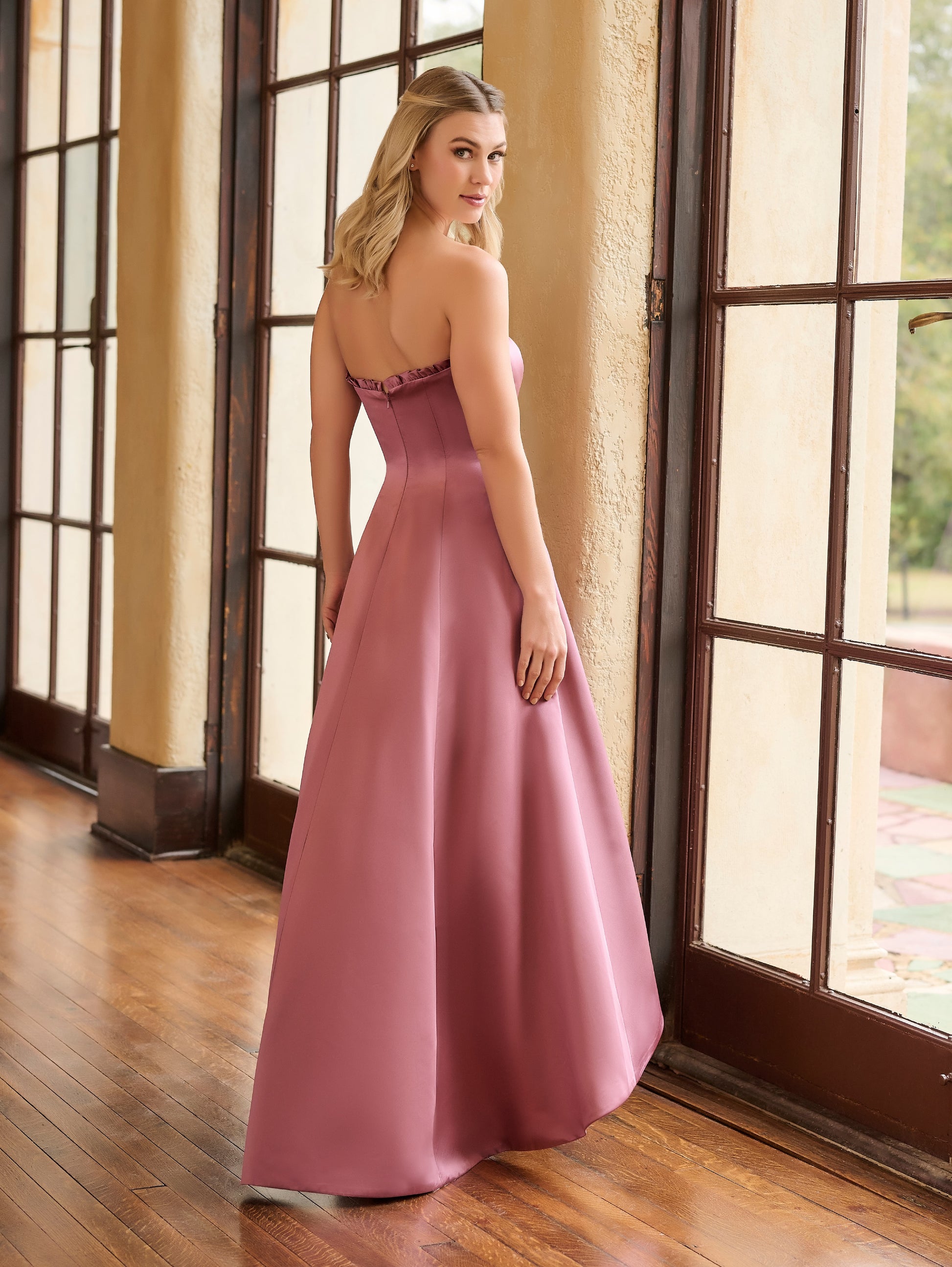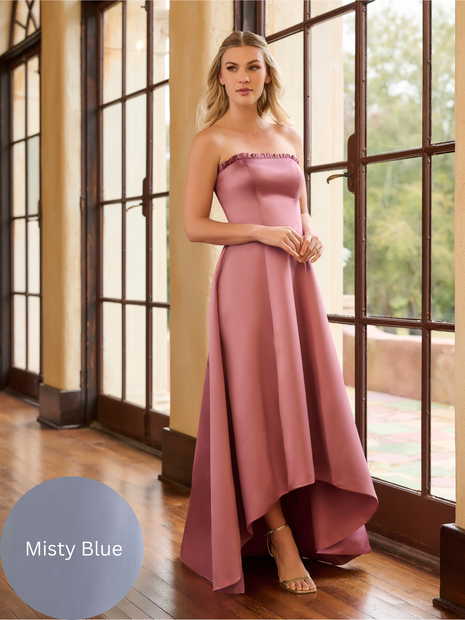 This elegant satin A-line dress features a straight, strapless neckline adorned with delicate micro ruffles and a stylish high-low hem, creating a refined and graceful silhouette.