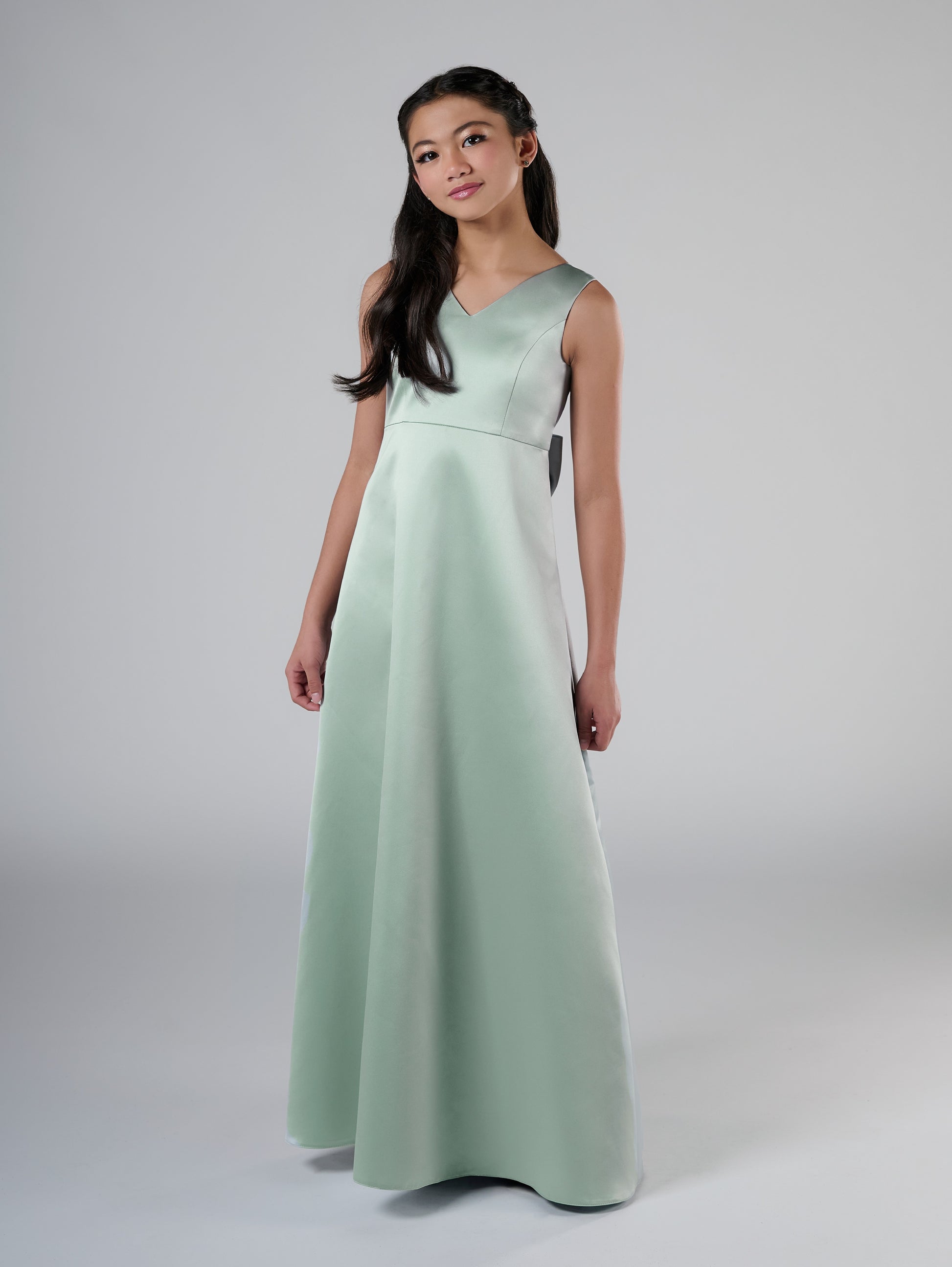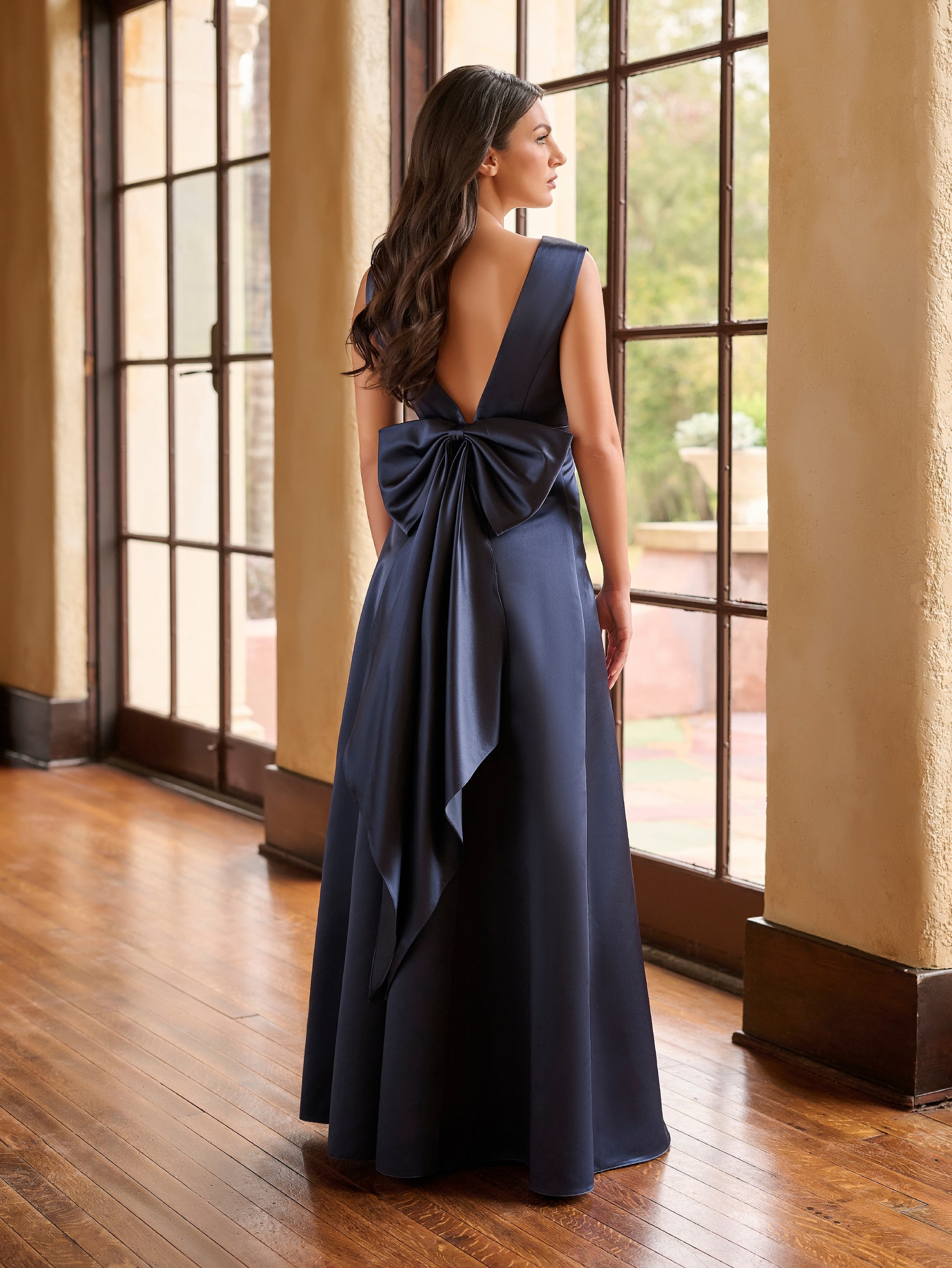 This satin A-line gown features a plunging V-neckline and a low V-back, elegantly complemented by a removable bow at the back.