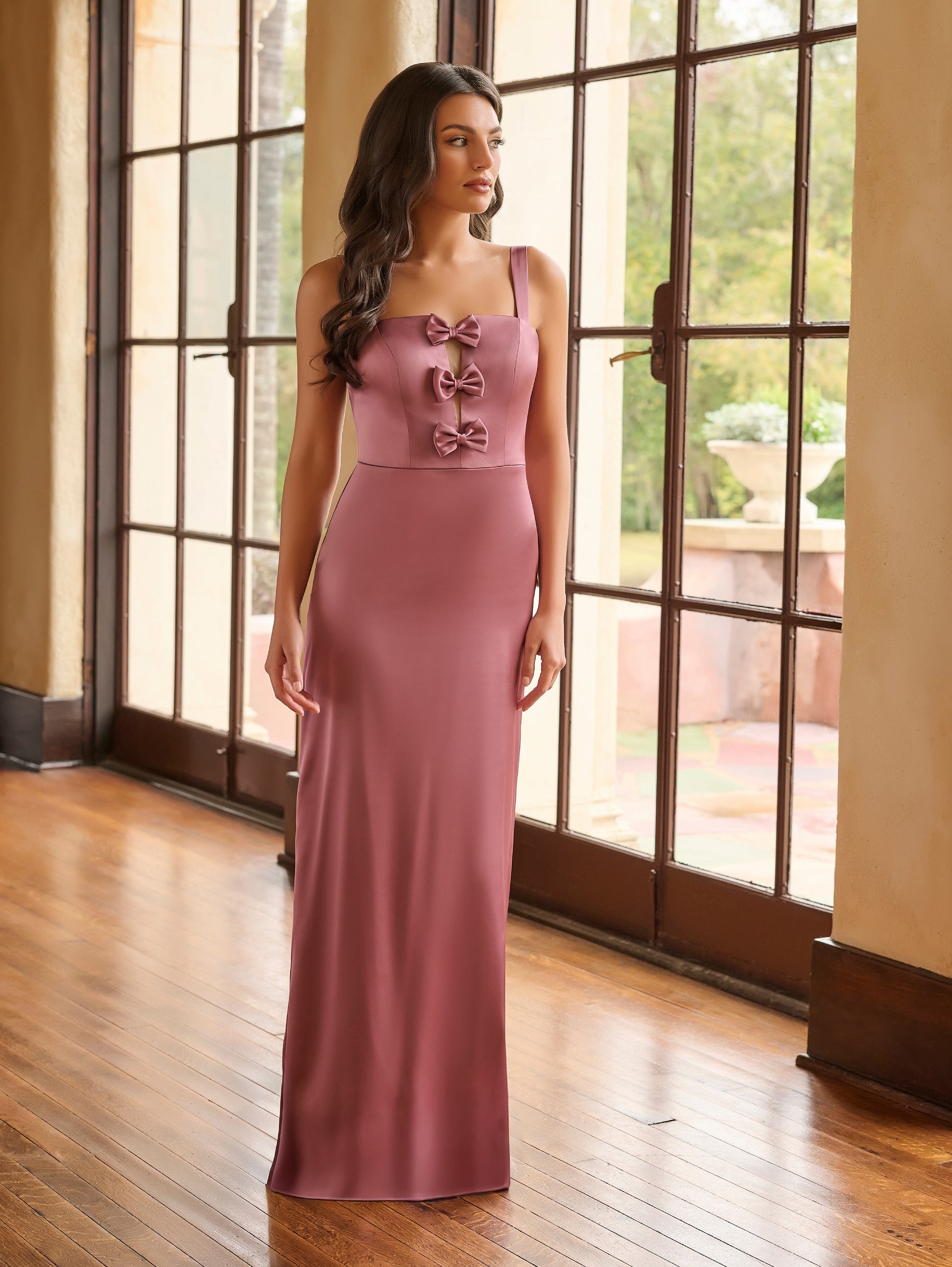 This sheath dress features a square neckline and a stretch matte charmeuse fabric, complemented by bows and a deep illusion V-neck for an elegant touch.