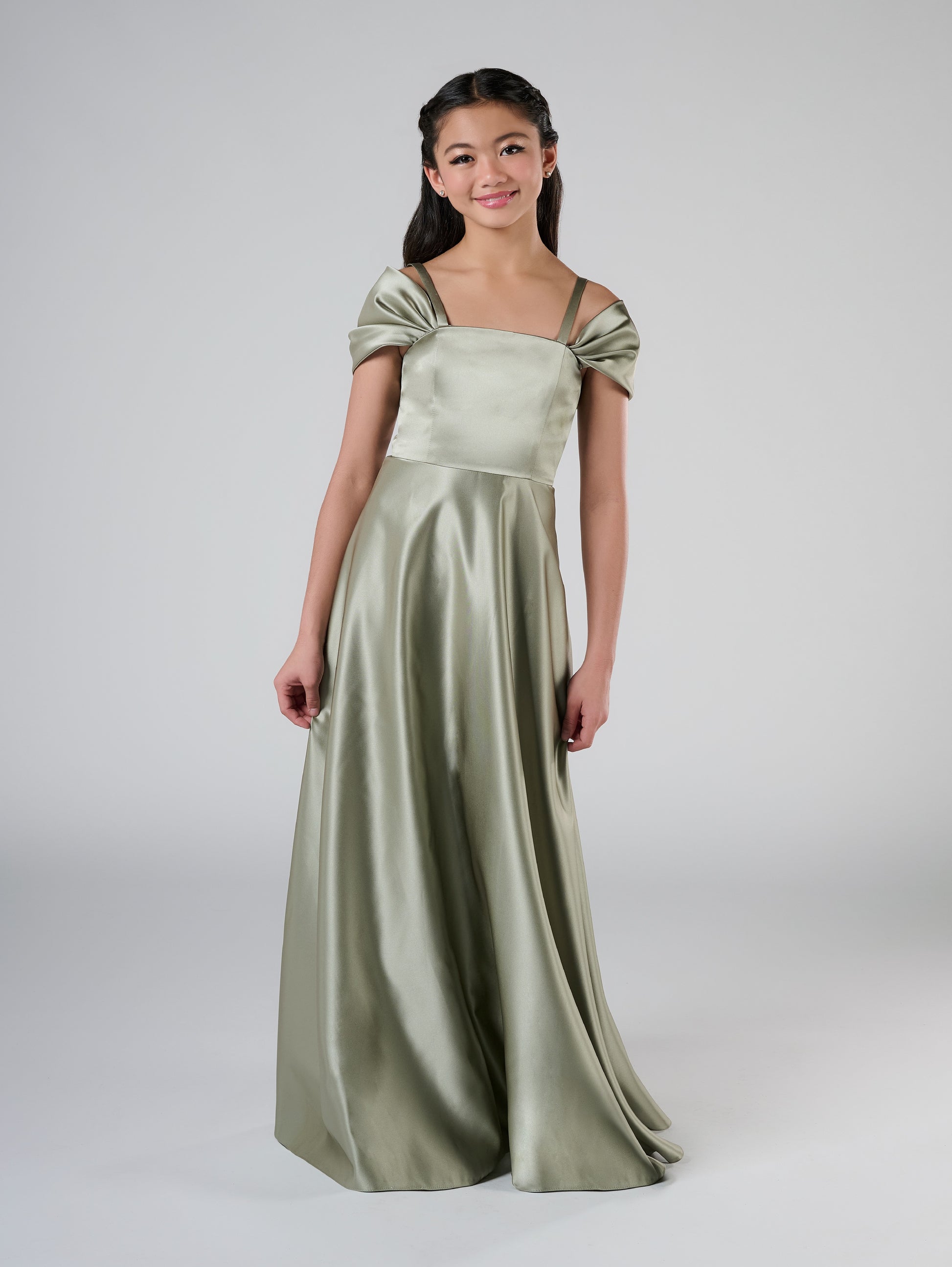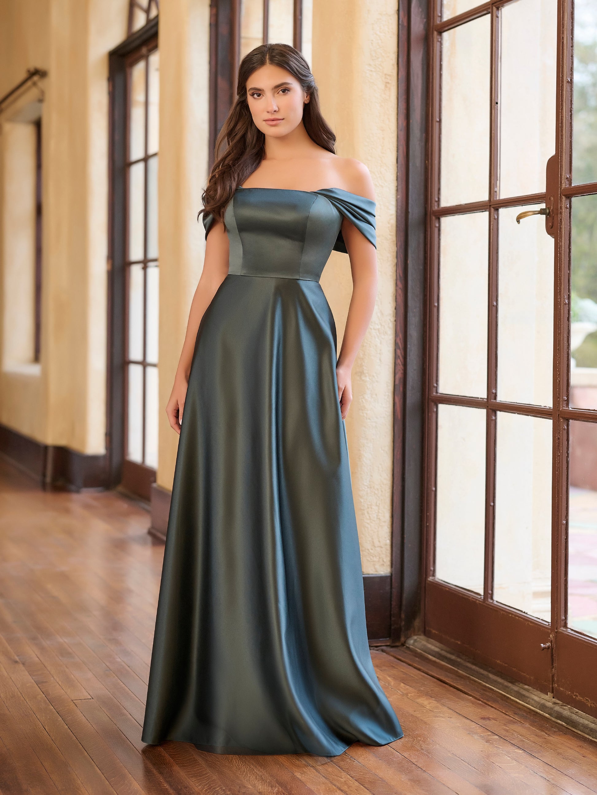 This sophisticated gown showcases detachable draped off-the-shoulder straps accented with a back knot, a satin A-line skirt, a tailored corset bodice, and convenient pockets for added functionality.