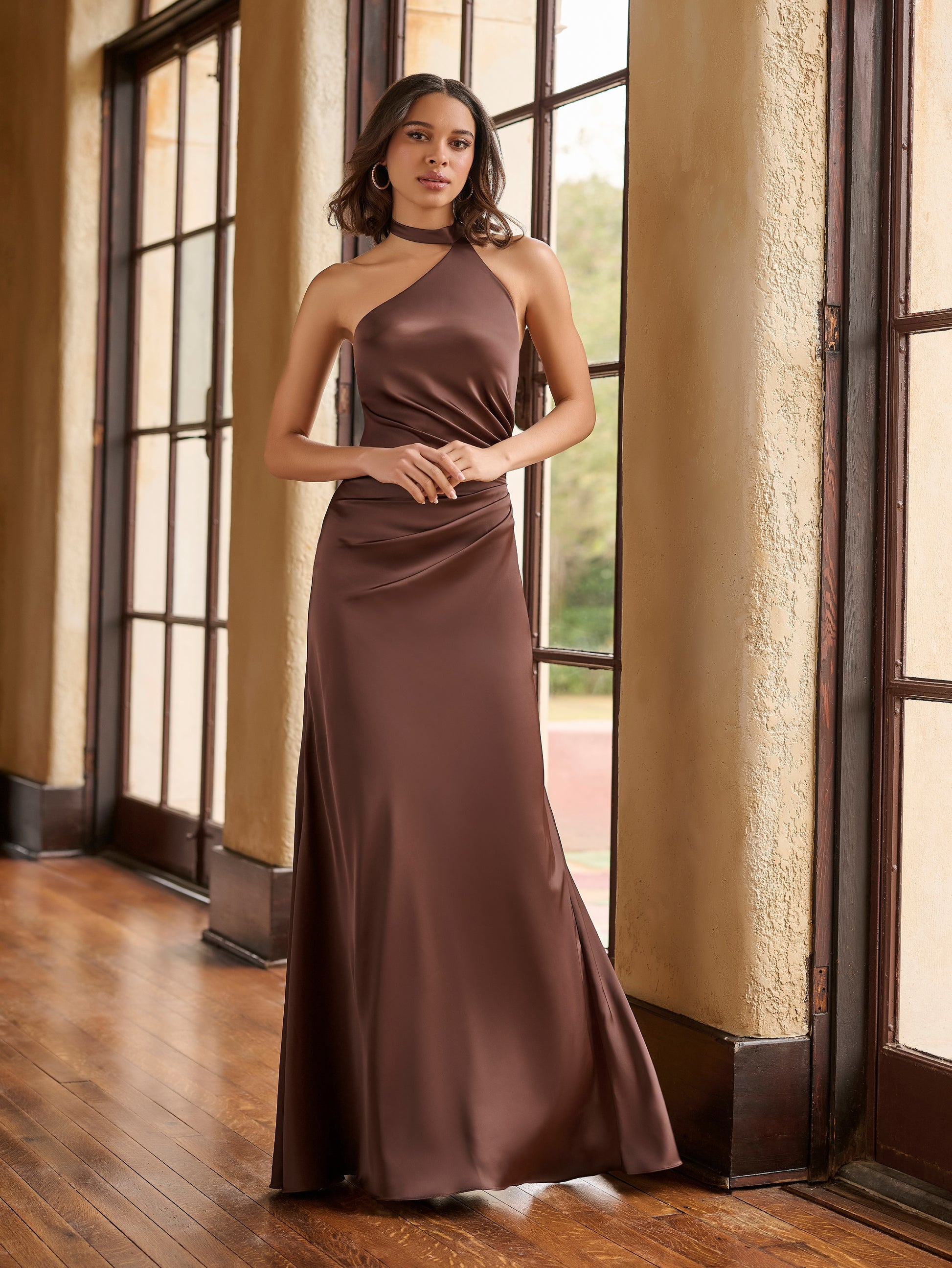 This elegant trumpet gown features an asymmetric high-neck halter design crafted from stretch matte charmeuse, complemented by a draped bodice and an attached self-tied fabric scarf for a refined finish.