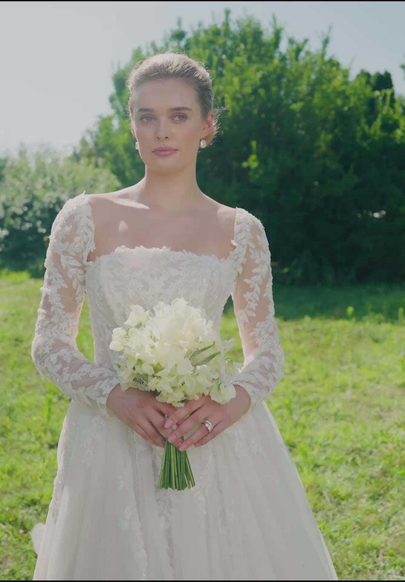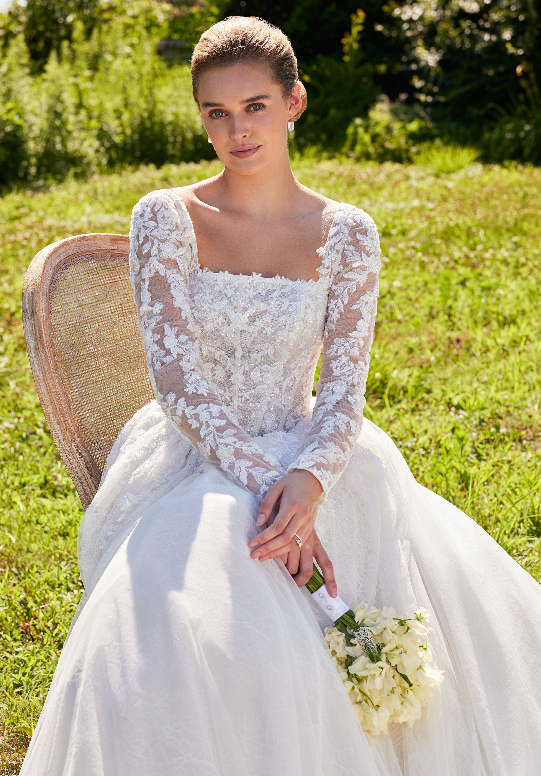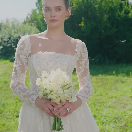 Our Seattle designer wedding dress is a Victorian-inspired gown with a modern bridal twist. The beautiful ball gown has a crescent neckline with breathtaking beaded, embroidered lace appliqués cascading down the Chantilly lace dress. The modified basque waist draws the eye in and down the soft A-line skirt, while voluminous bustles create an hourglass silhouette. The beautiful bodice is lined for a more modest look. It is also available unlined.
