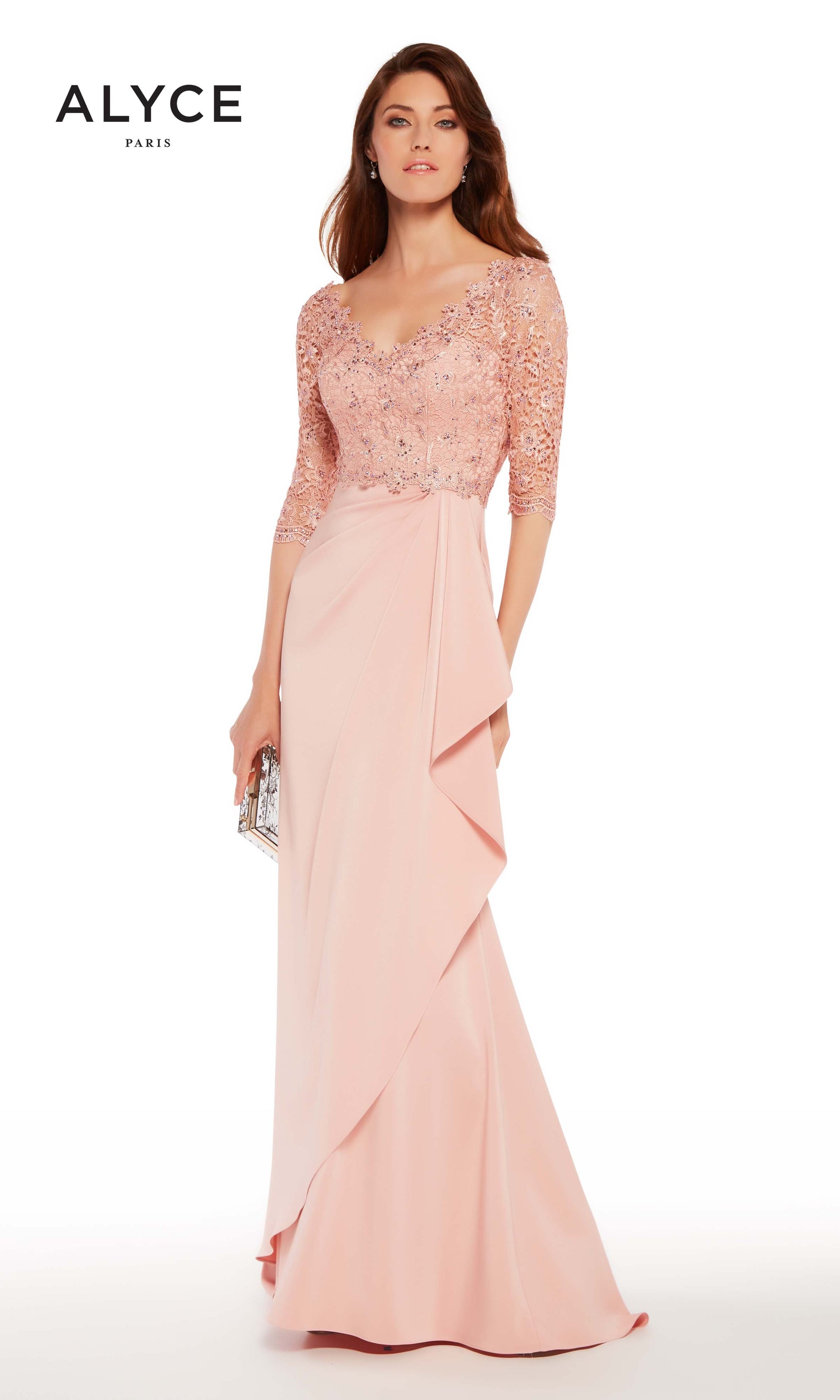 This sophisticated dress features a long A-line design made from stretch crepe-lace. It showcases a graceful V-neck and V-back, making it an ideal choice for gala events, evening occasions, or for the mother of the bride or groom. Available in plus-size.