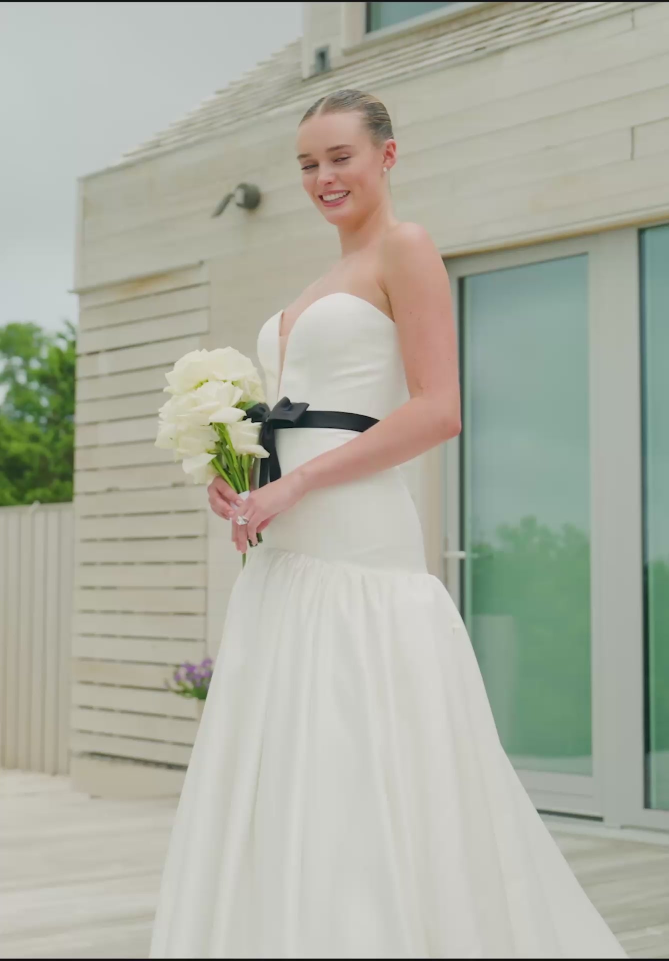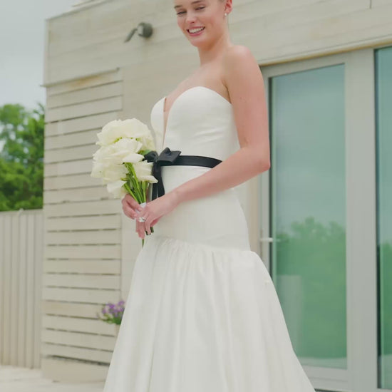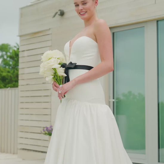 Our Simone designer wedding dress is inspired by modern couture design. The structured bodice has a strapless sweetheart neckline that dips down into a deep-v plunge, drawing the eye down to the dropped waistline, exaggerating the silhouette. The ball gown skirt then flows out around you with the classic look of buttons leading down to the hemline. A detachable satin bow belt helps to define your figure in either monochromatic white or bold, contrasting black.