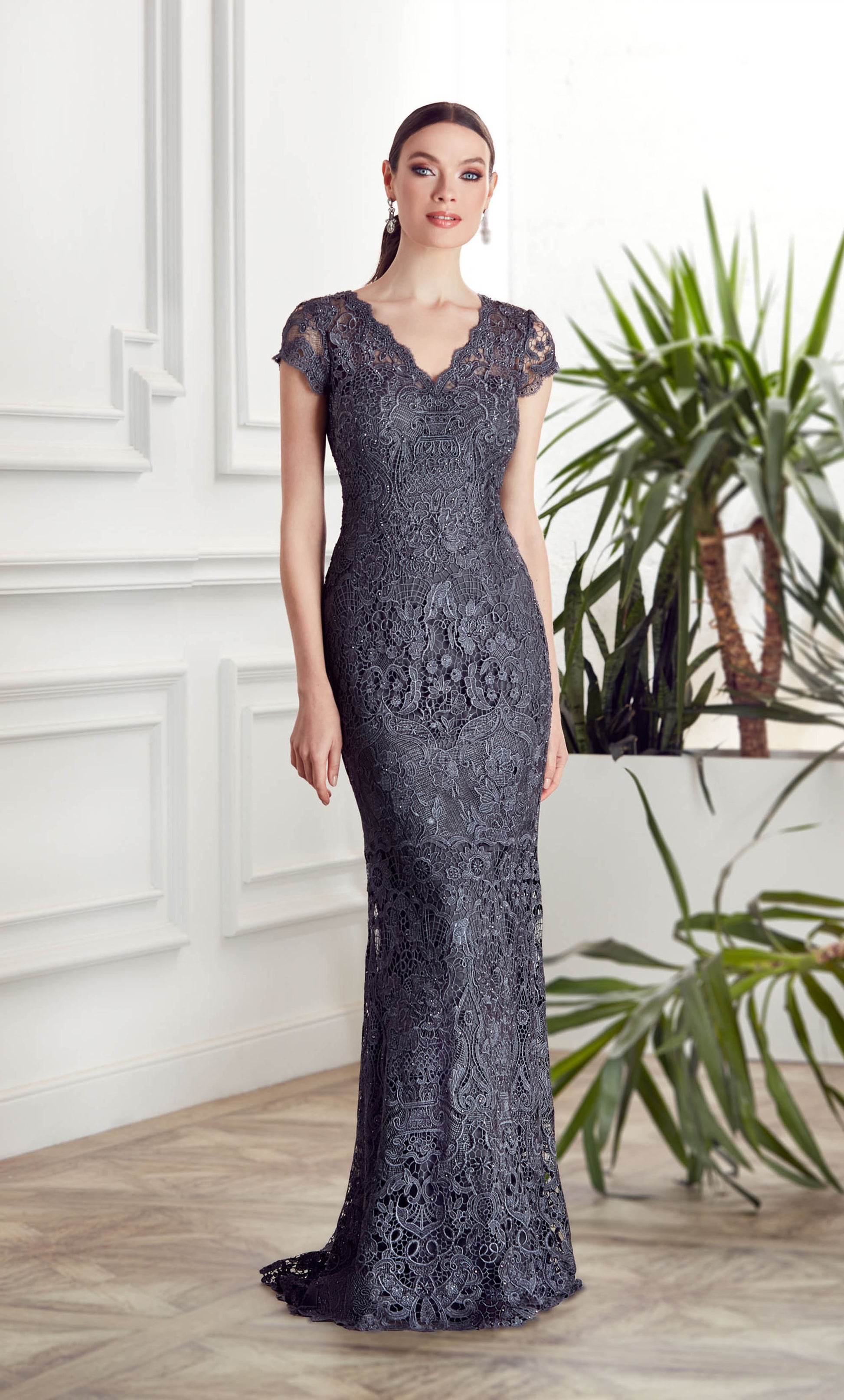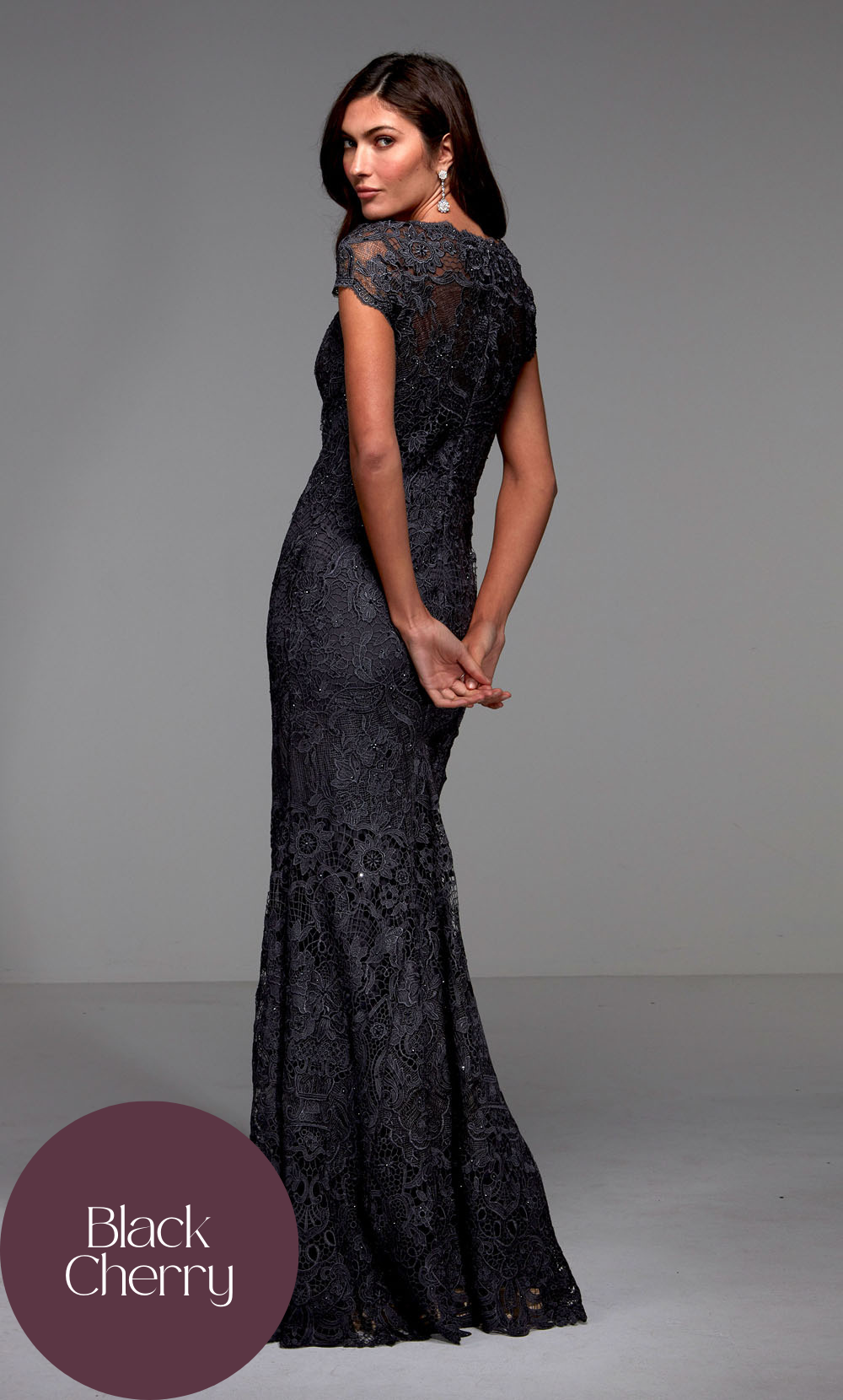 This elegant gown features a straight silhouette crafted from delicate lace, highlighted by a V-neckline and an illusion back. Its long length and refined embellishments make it an ideal choice for formal events such as military balls, black-tie affairs, or as attire for the mother of the bride or groom.