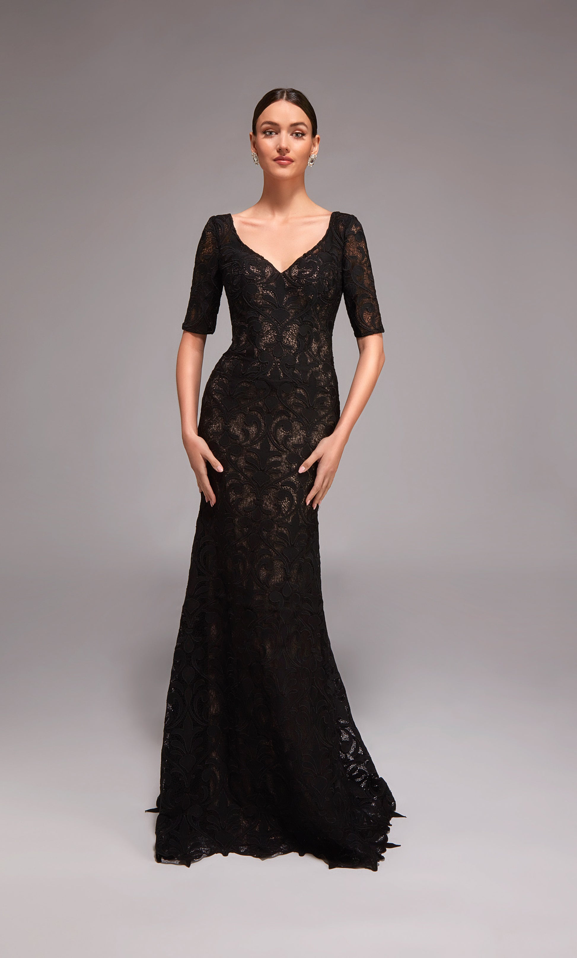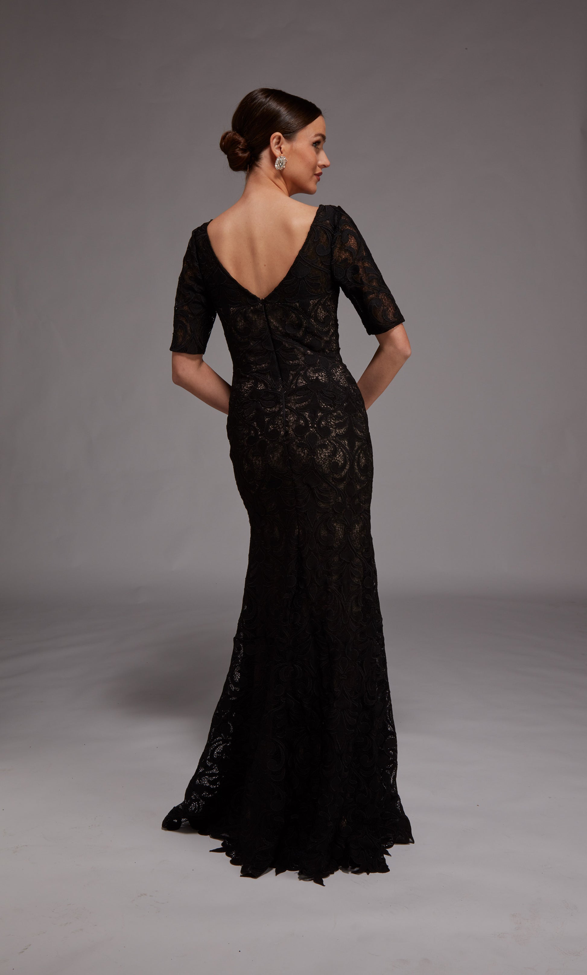This elegant evening gown features a long silhouette with intricate lace detailing, a modest mermaid cut, a refined V-neckline and V-back, complemented by graceful elbow-length sleeves.