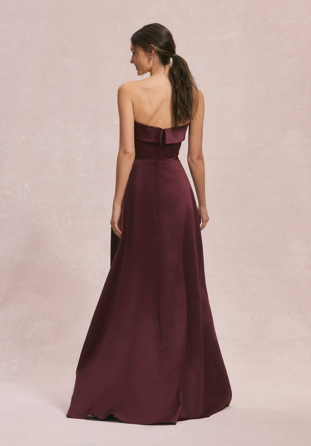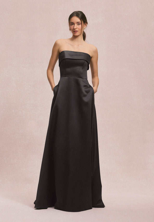 This strapless A-line bridesmaid dress is elevated by a structured cummerbund detail that defines the waist and flatters the silhouette. Designed in a clean, timeless satin with hidden pockets, the dress balances classic elegance with understated charm.