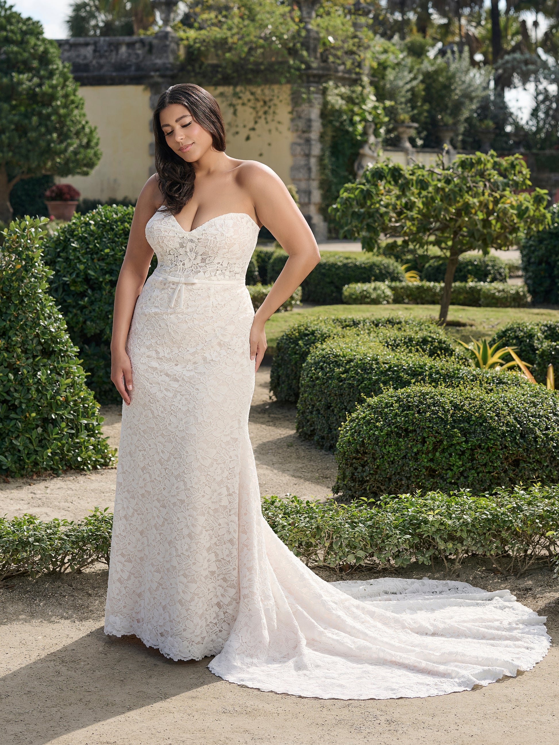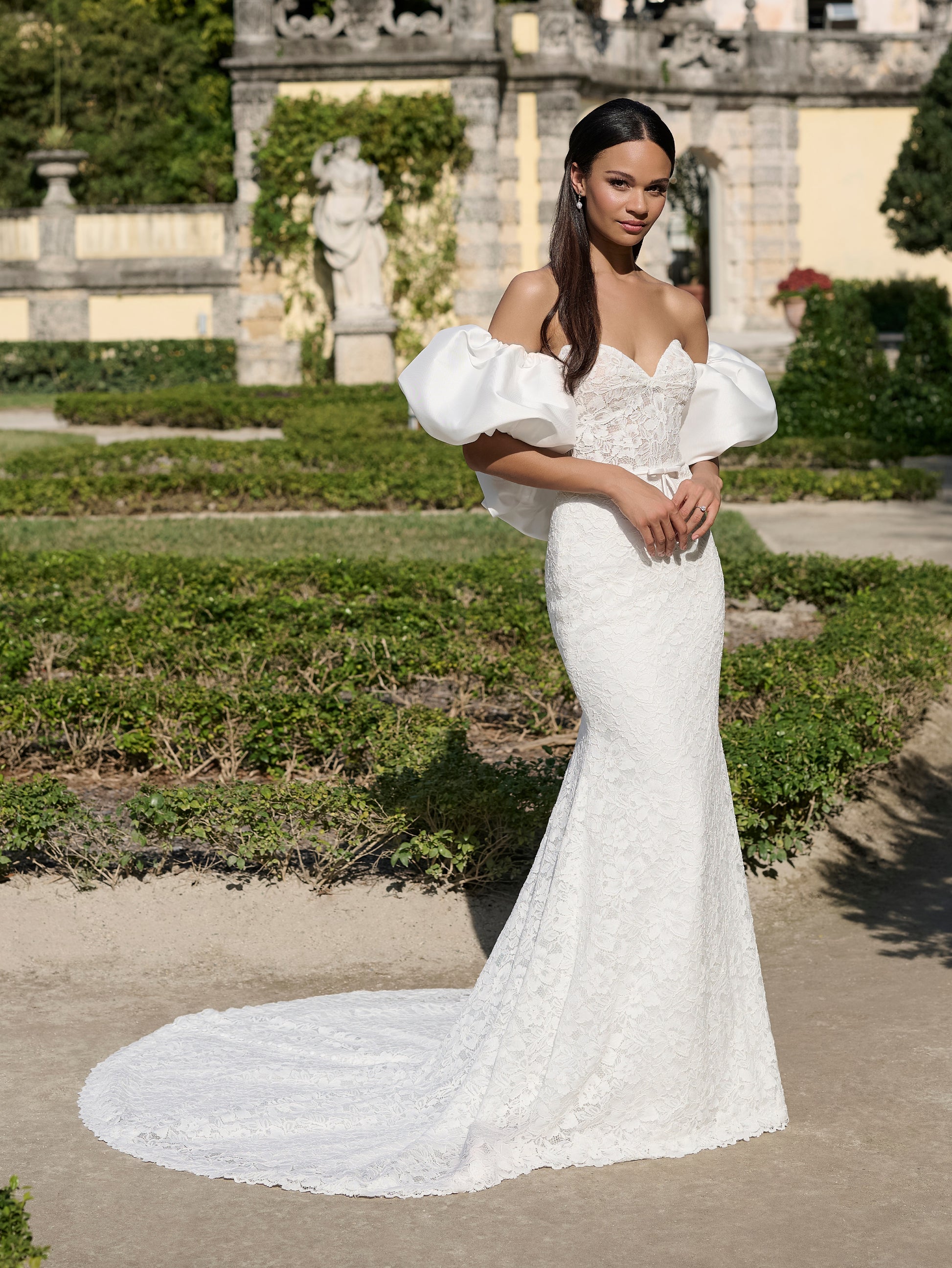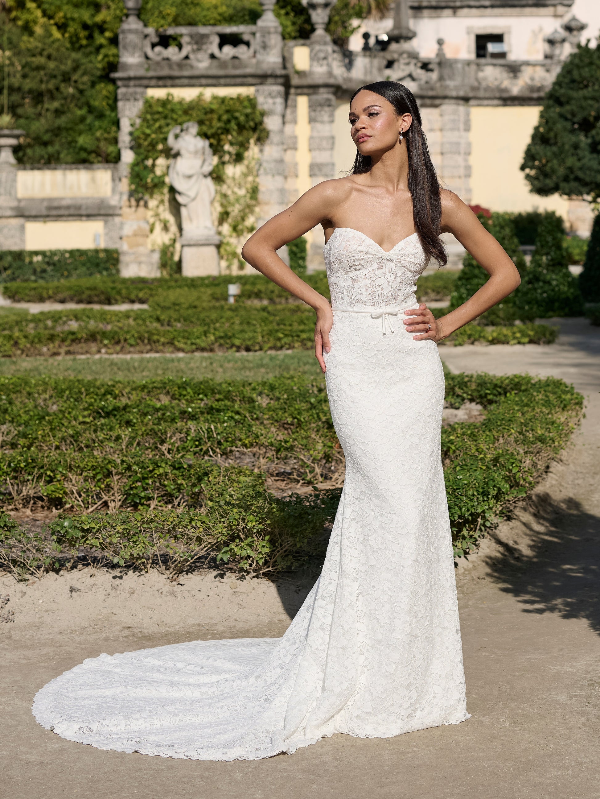 This slim, strapless gown with a sweetheart neckline is covered in lace and features a sweet bow at the waist, complete with a detachable Mikado shrug for a charming touch.