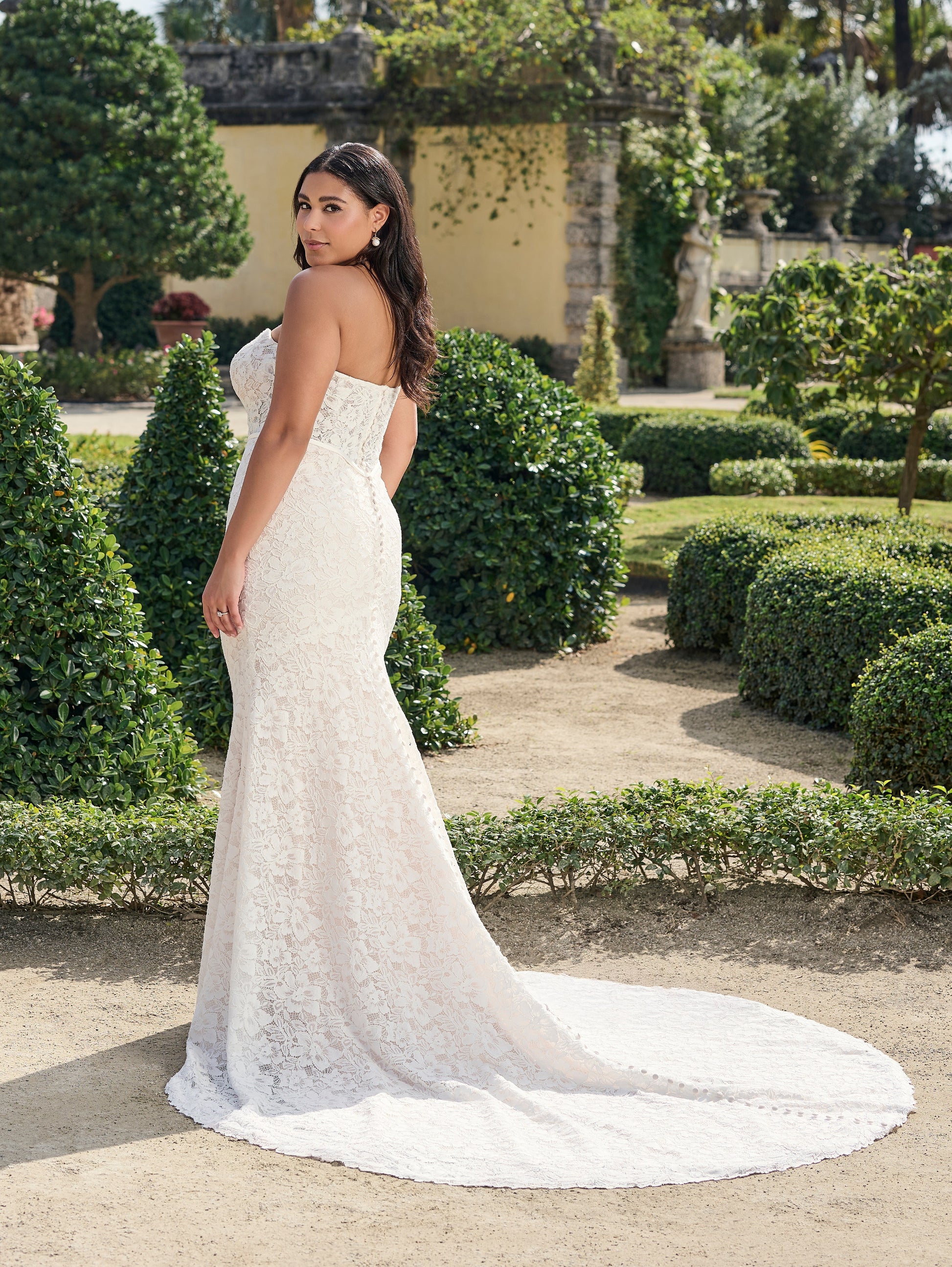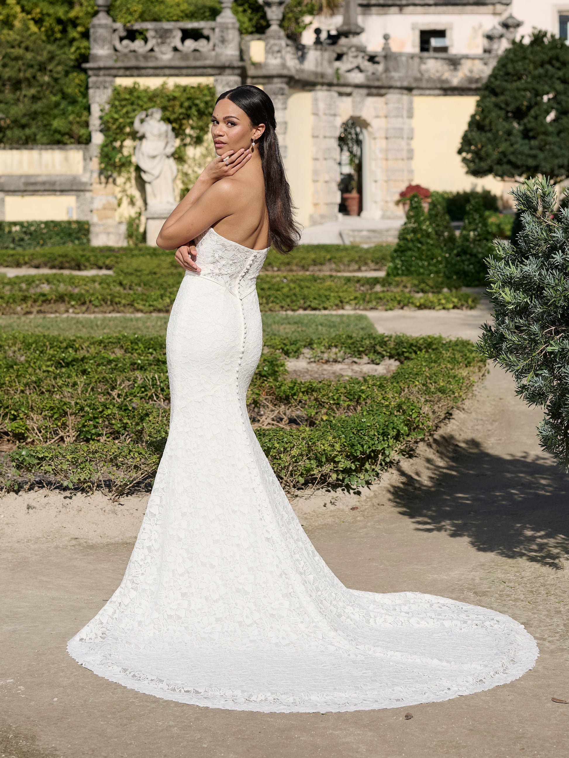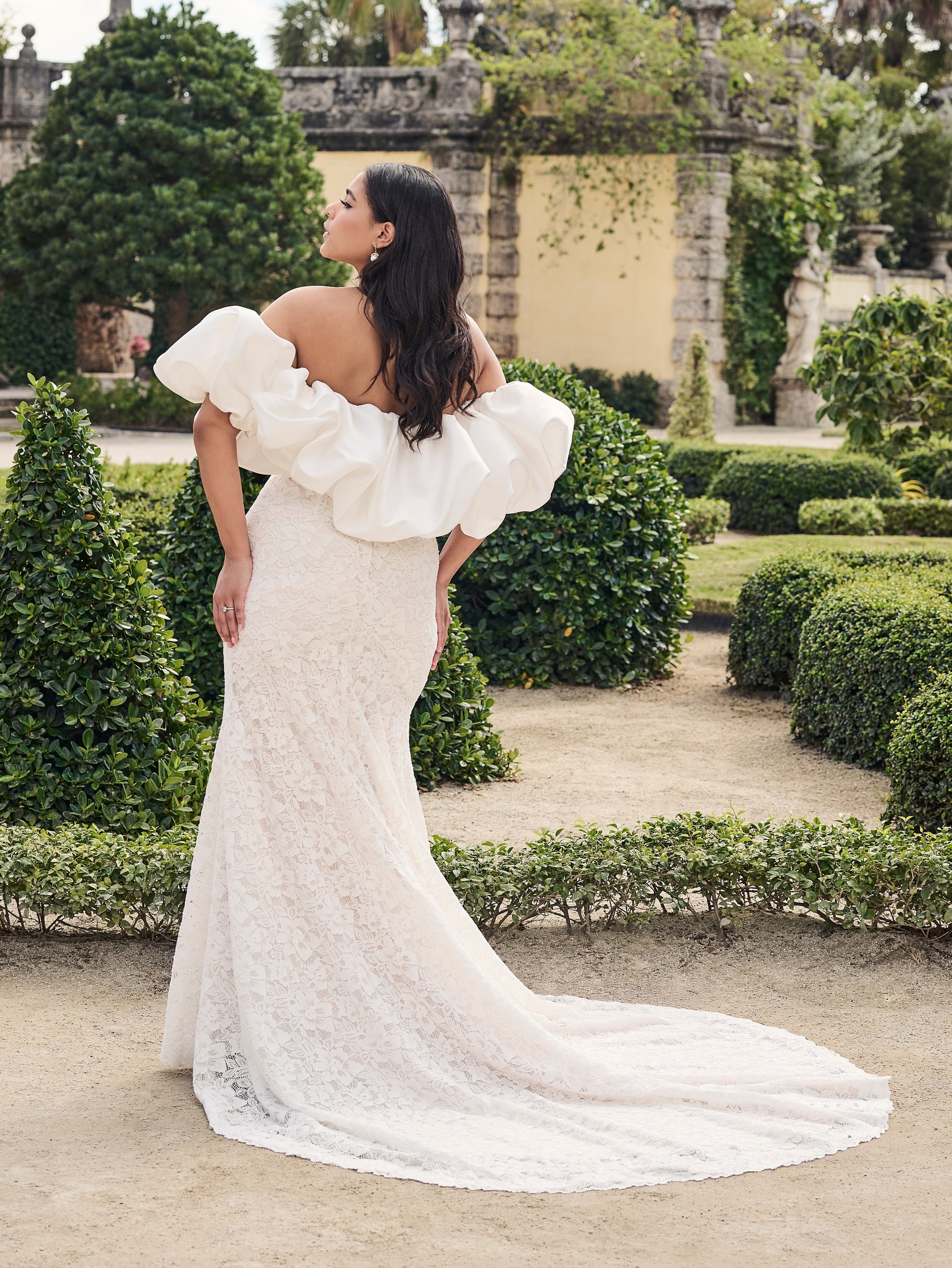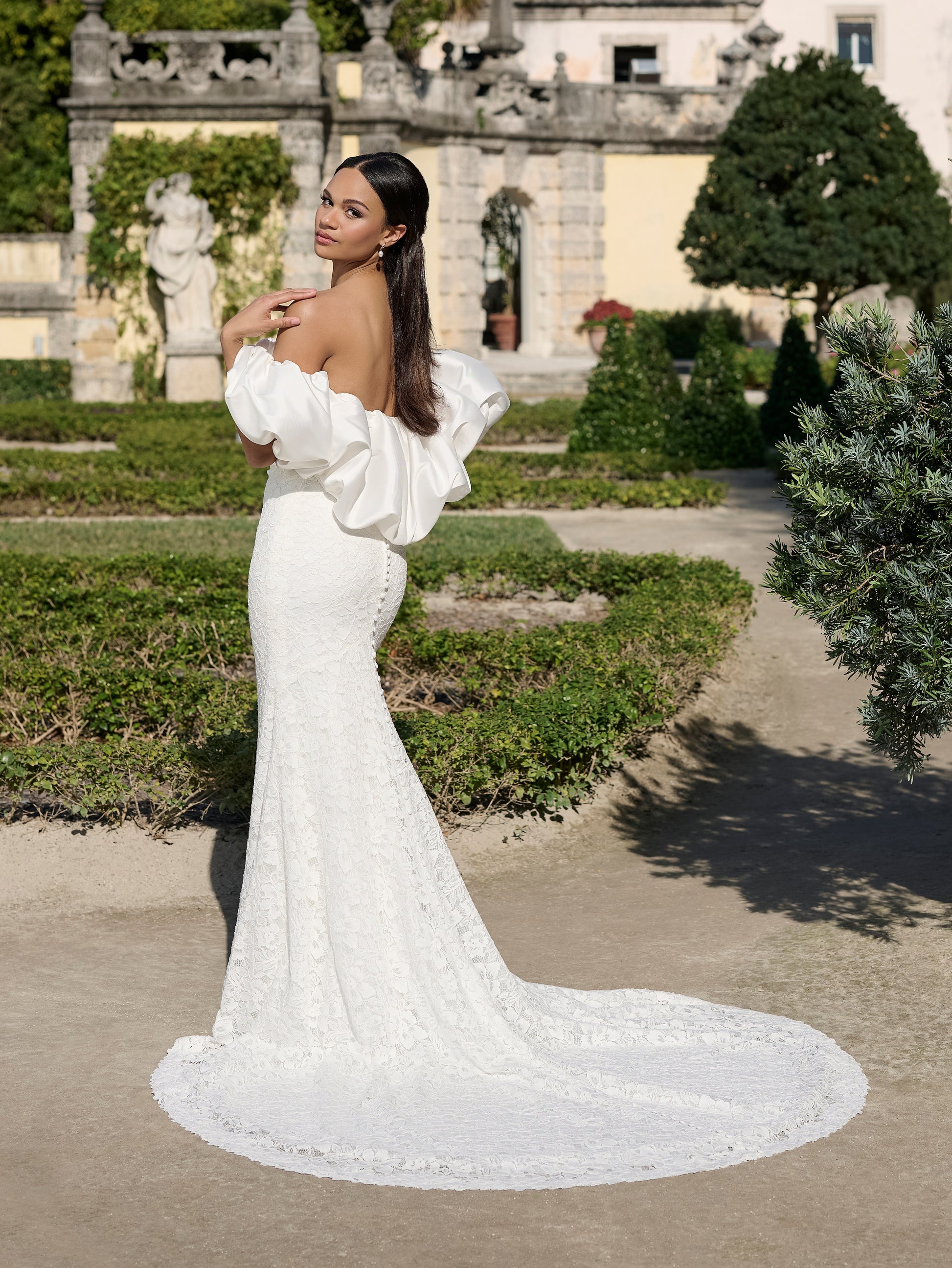 This slim, strapless gown with a sweetheart neckline is covered in lace and features a sweet bow at the waist, complete with a detachable Mikado shrug for a charming touch.