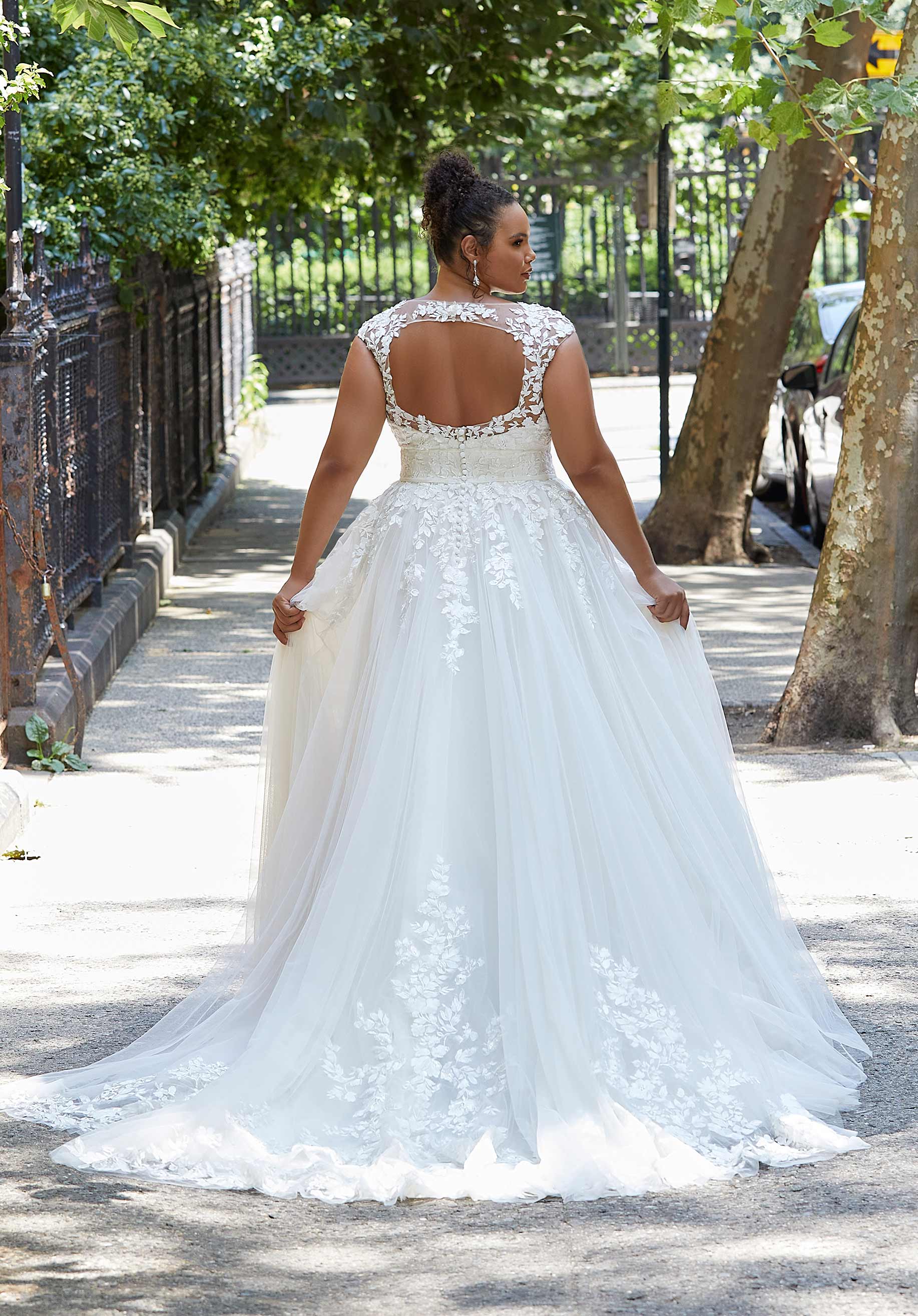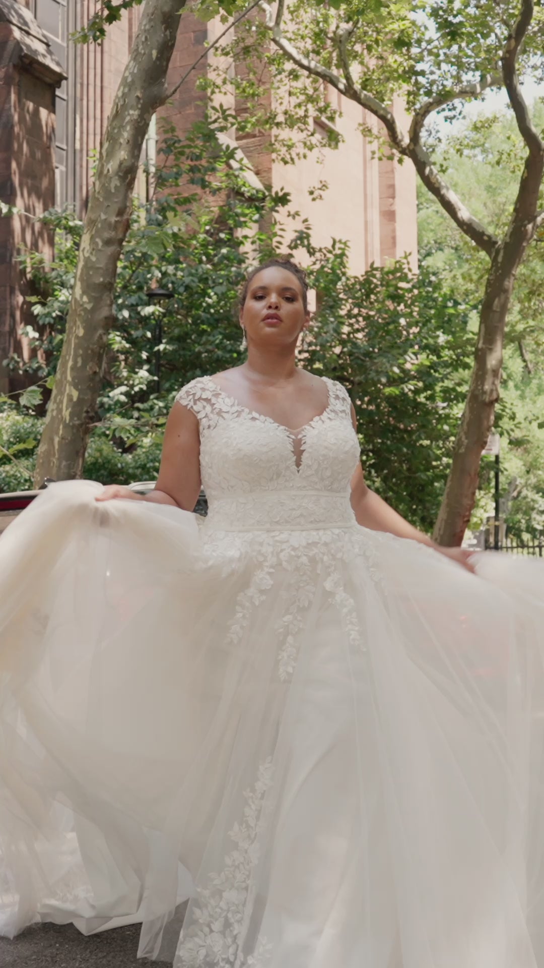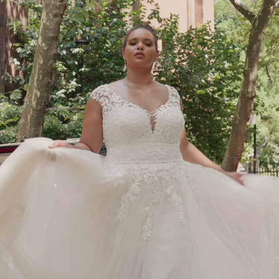 Effortlessly elegant, our Hadley designer wedding dress is a boho dream with botanical-inspired, crystal-beaded beaded embroidered lace appliqués cascading down from the sheer V-neck bodice. The double waistband detail cinches in your figure on the soft tulle A-line that has an ethereal effect with peek-a-boo appliqués. The best part is the open keyhole back that will wow your guests as you walk down the aisle.