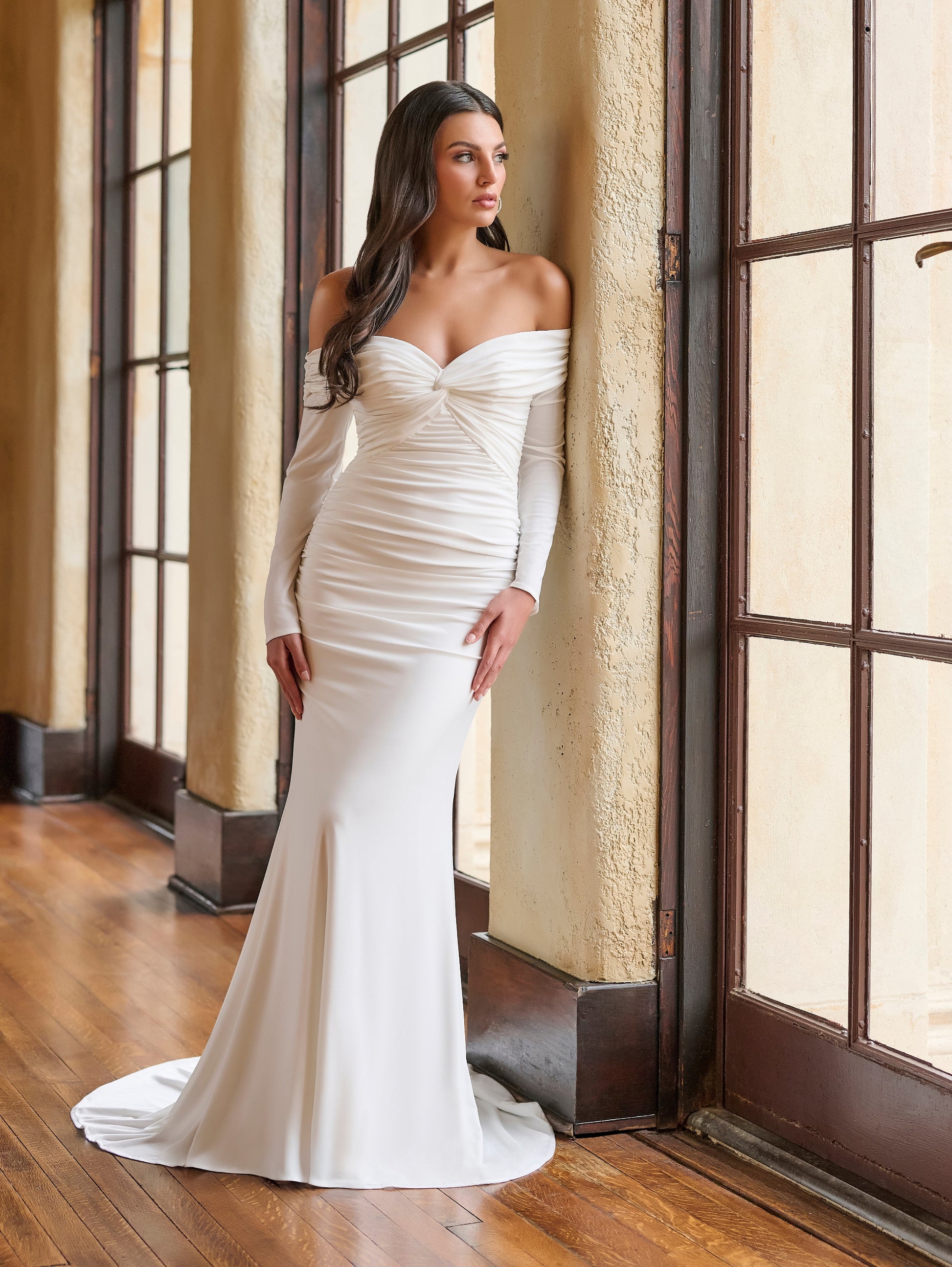 This destination wedding gown features a fitted, off-the-shoulder design crafted from stretch jersey, with long sleeves and a twisted knot detail at the bodice for an elegant silhouette.
