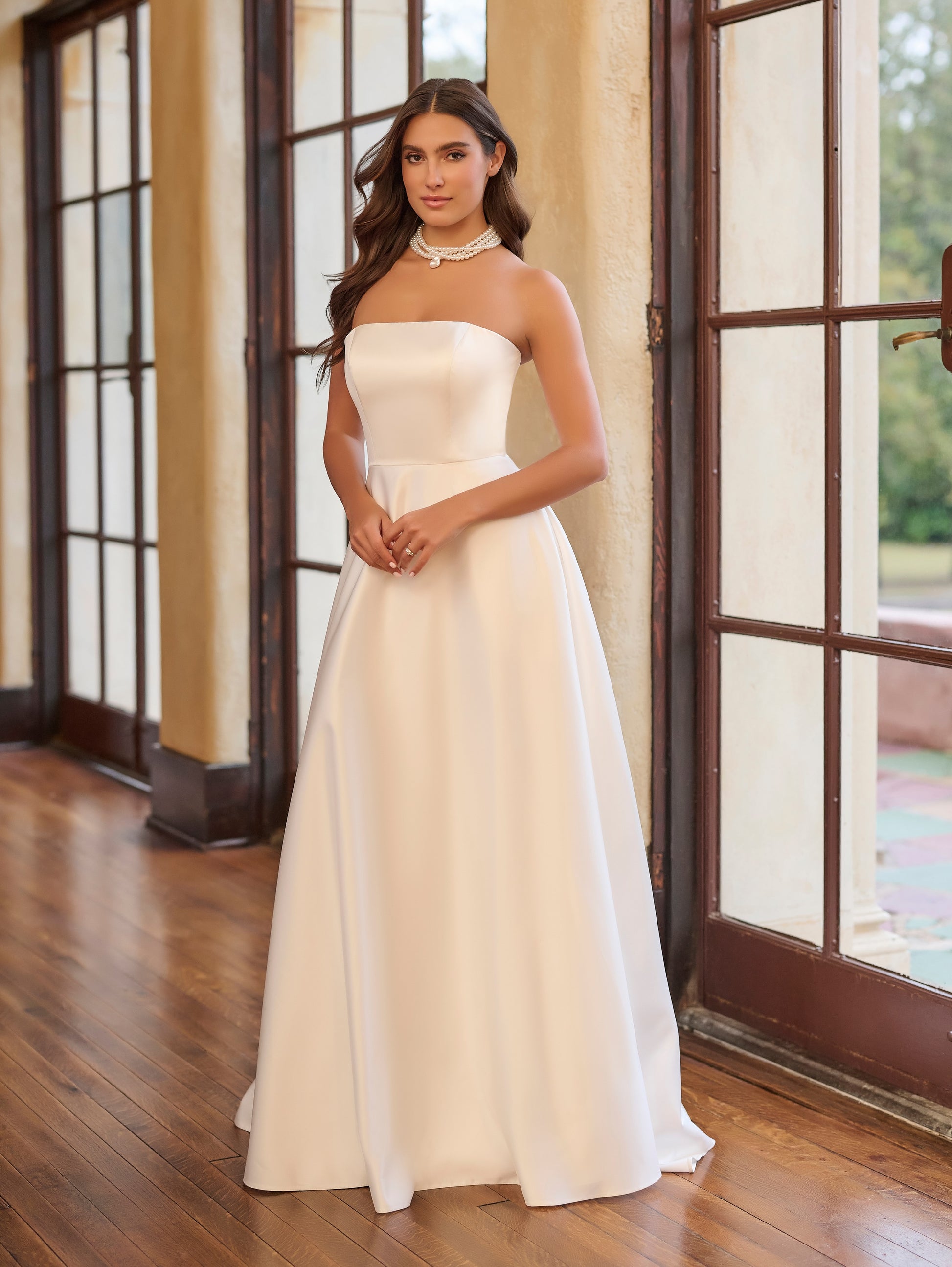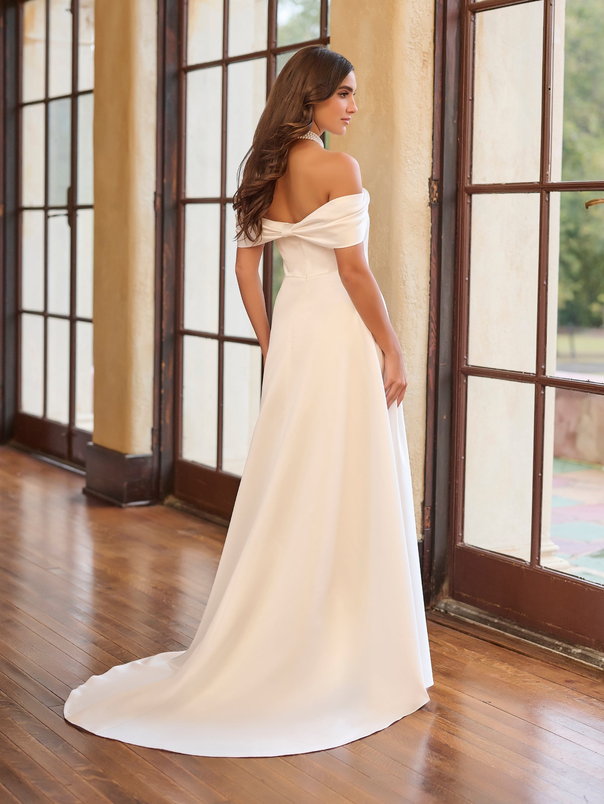 This elegant destination bridal gown features a satin A-line silhouette with an off-the-shoulder draped design, detachable draped straps, a straight neckline, and a clean, unadorned finish.