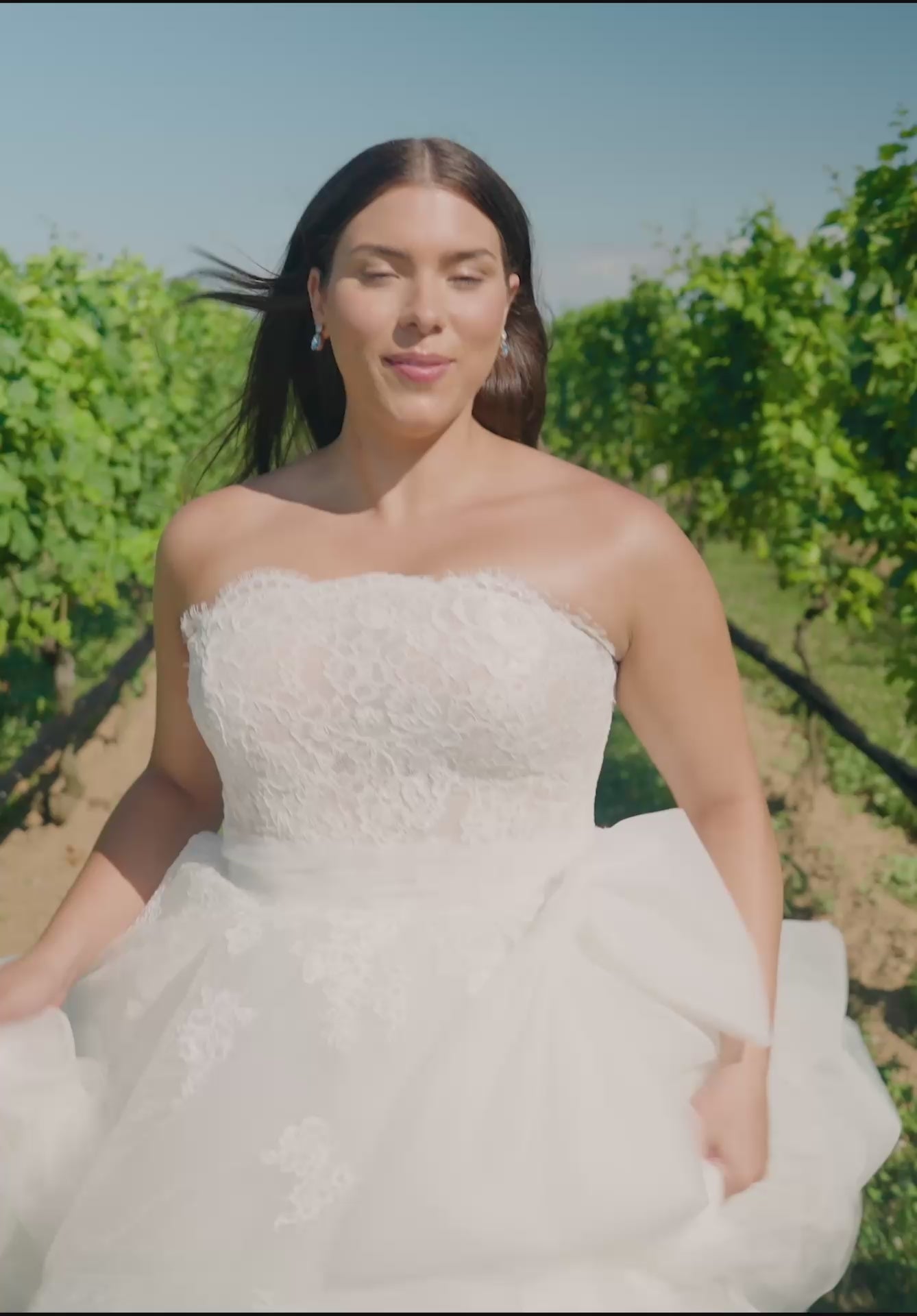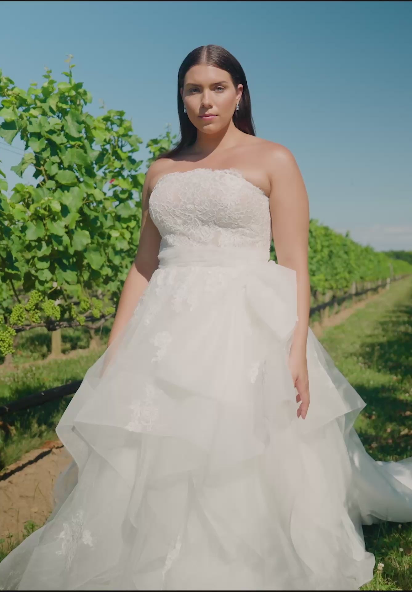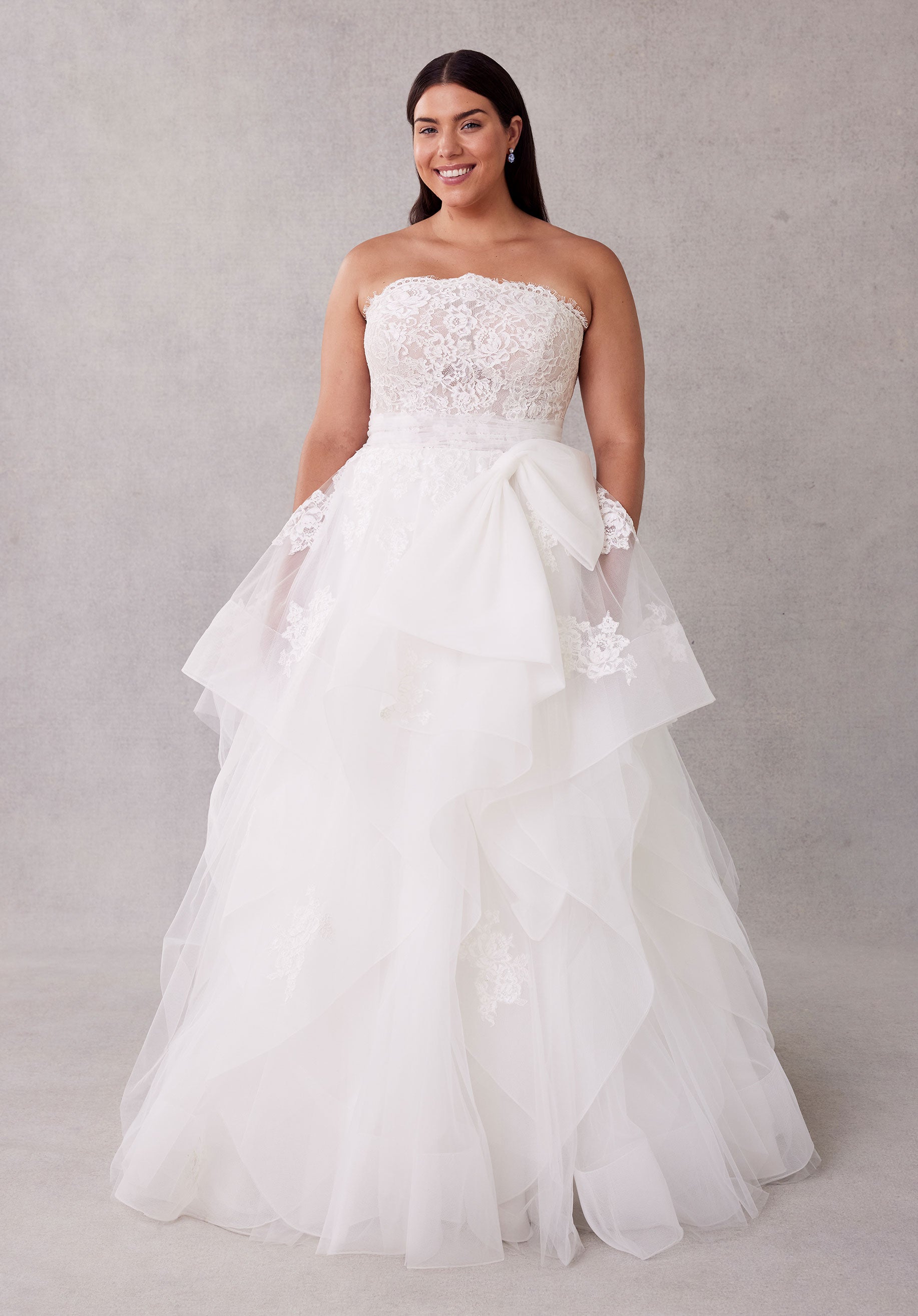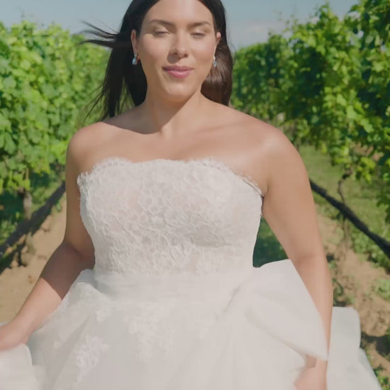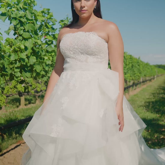 Our Santina designer wedding dress is an unexpectedly romantic ball gown featuring a stunning Alençon lace bodice with a scalloped strapless neckline and lace-up corset back. The tulle waistband defines your figure and ties into a lovely bow, where the bodice then meets the cascading ruffle skirt with a horsehair hem to add bounce and structure to each flounce detail. For a more modest look, the bodice is lined, but is available to order unlined.