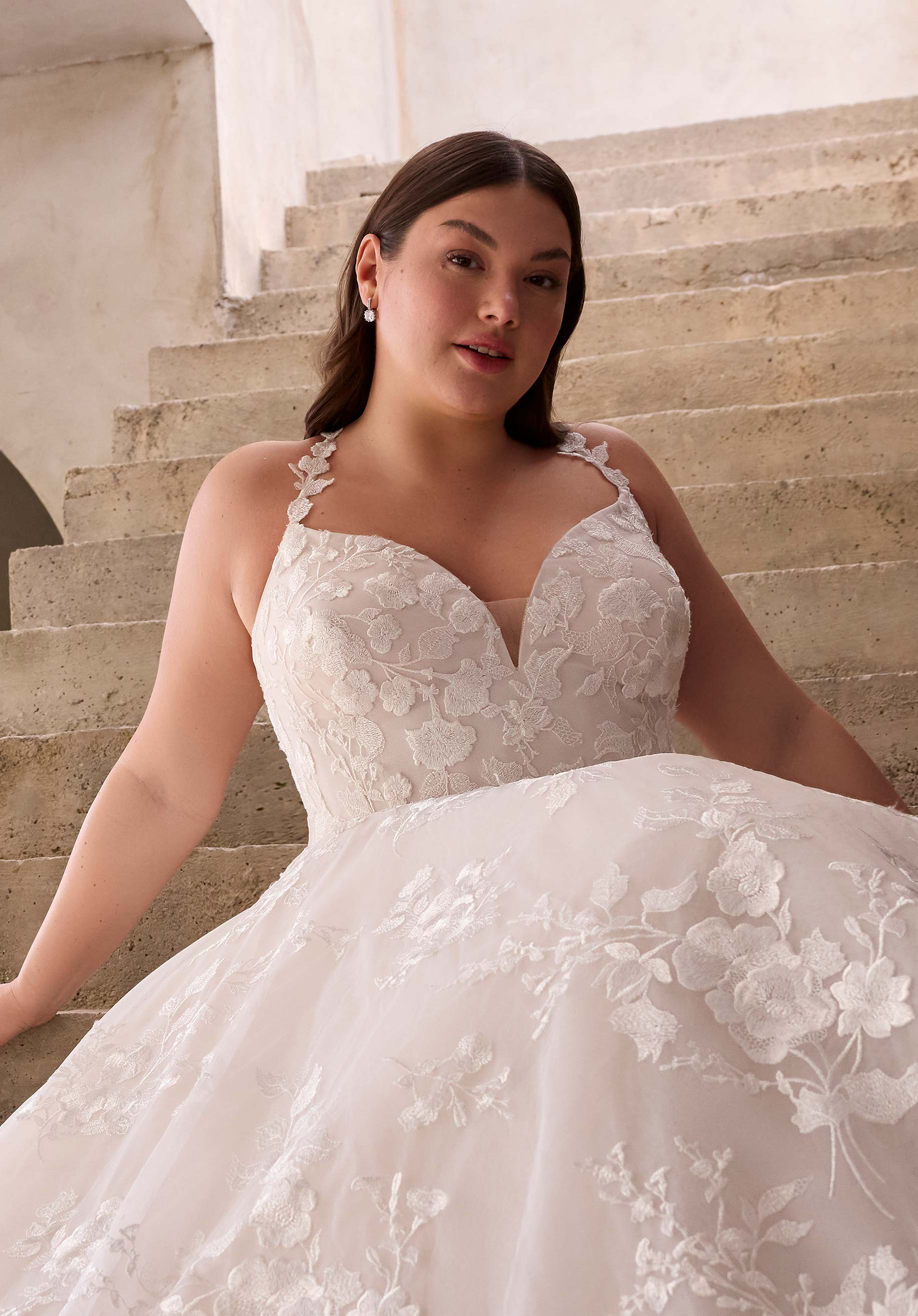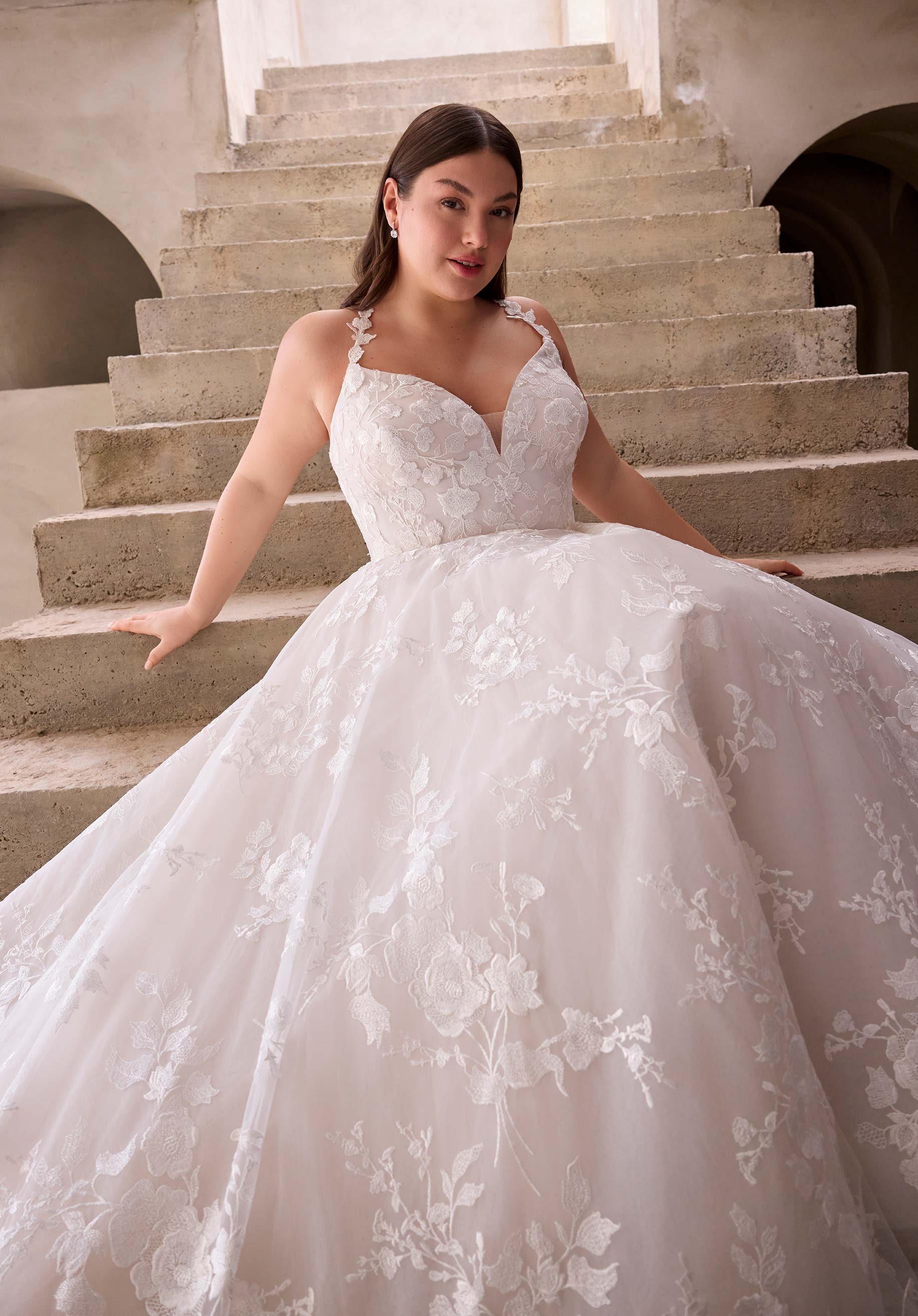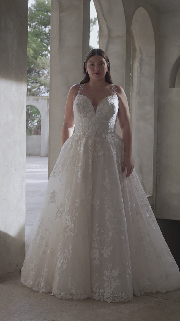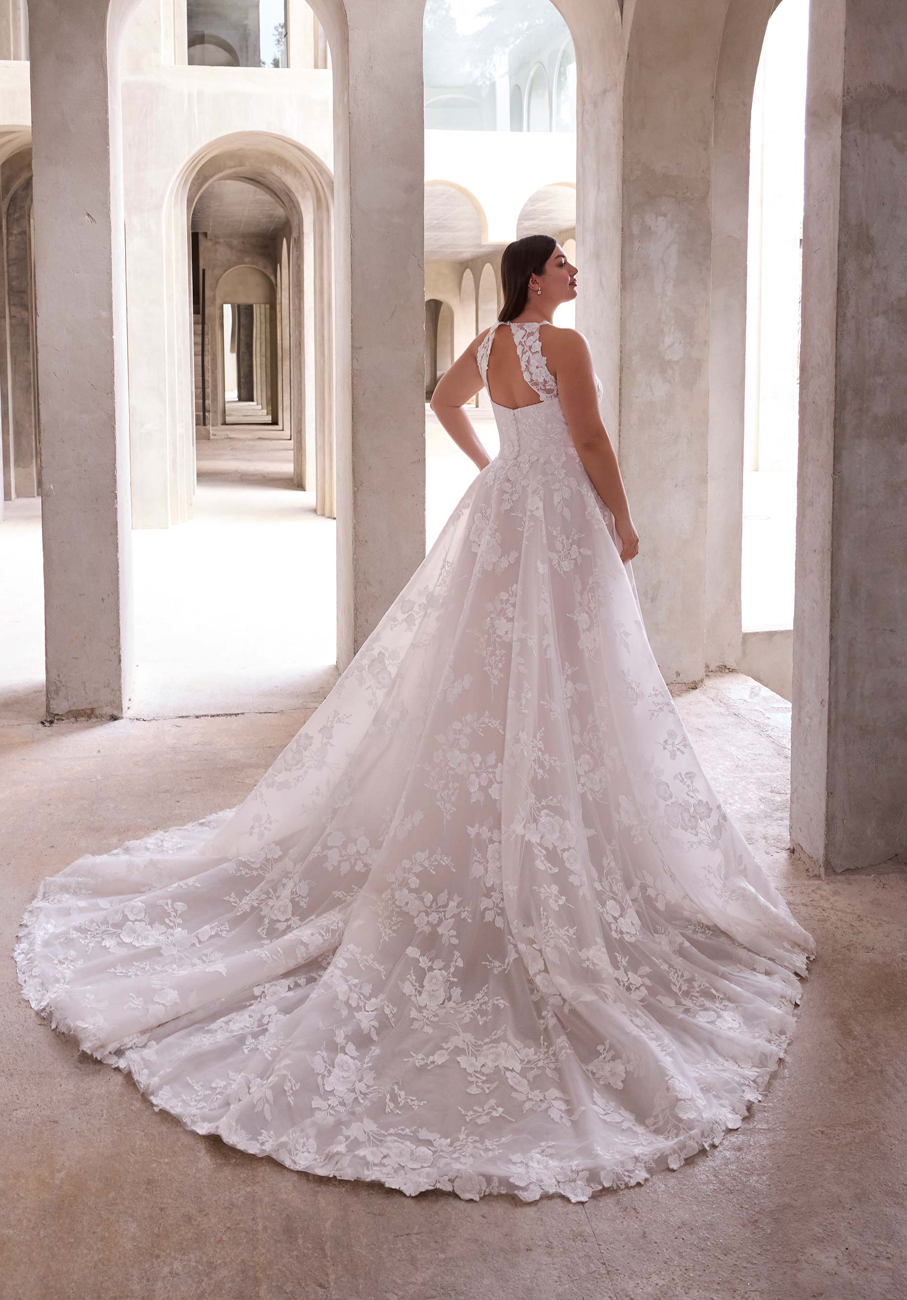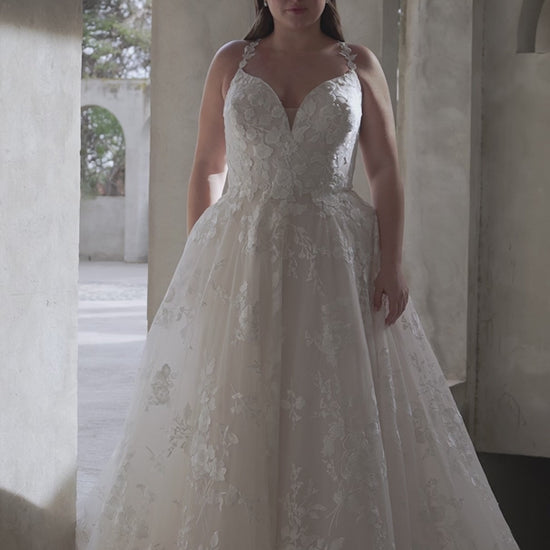 Our Minerva wedding dress embraces the beauty of classic bridal, featuring a flowing A-line silhouette enhanced by princess seam detailing and delicate corded lace overlay. The stylized v-neckline is framed by delicately appliquéd straps to create a stunning keyhole, while buttons guide the eye down to the graceful train. Hidden skirt pockets finish the dress, merging modern practicality with timeless romance.