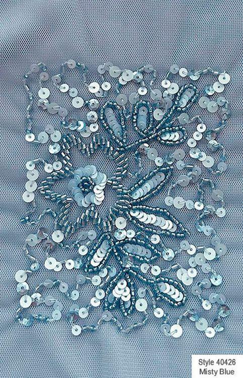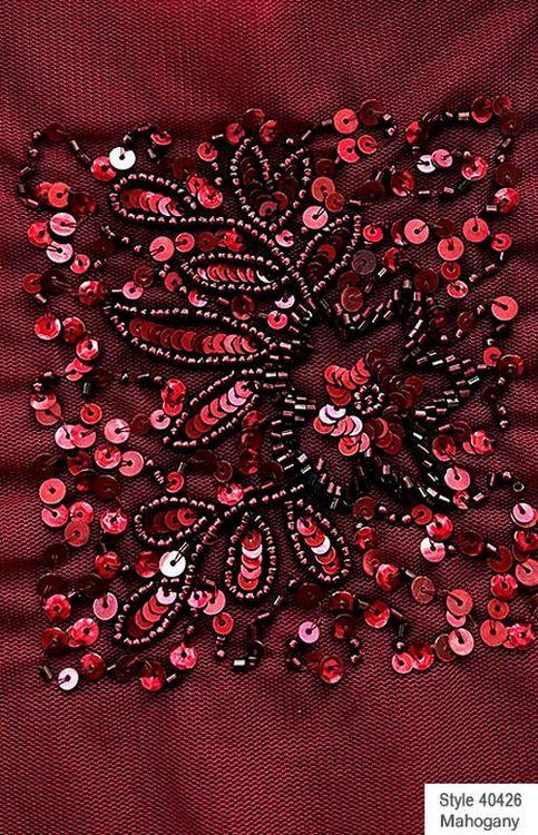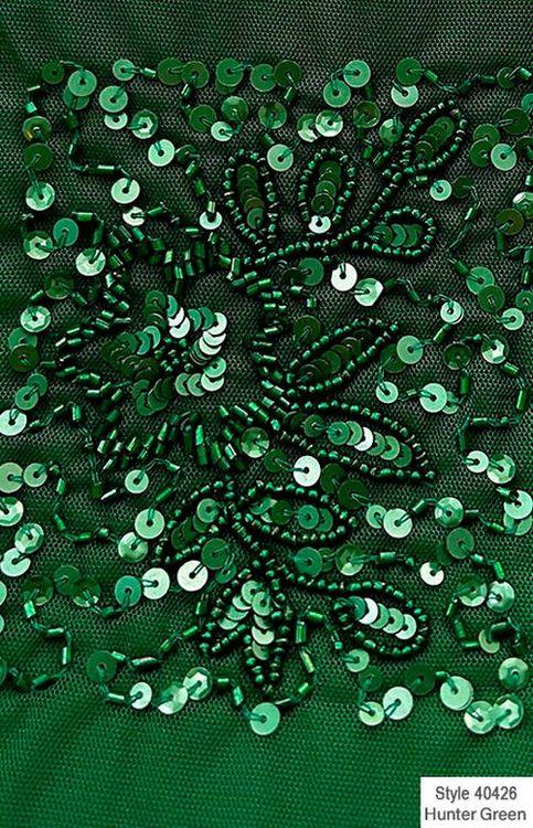 Shimmering surplice halter neckline gown features all-over sequin and floral motif beading. The soft A-line skirt falls off the hips with a slight flare for a truly flattering look.