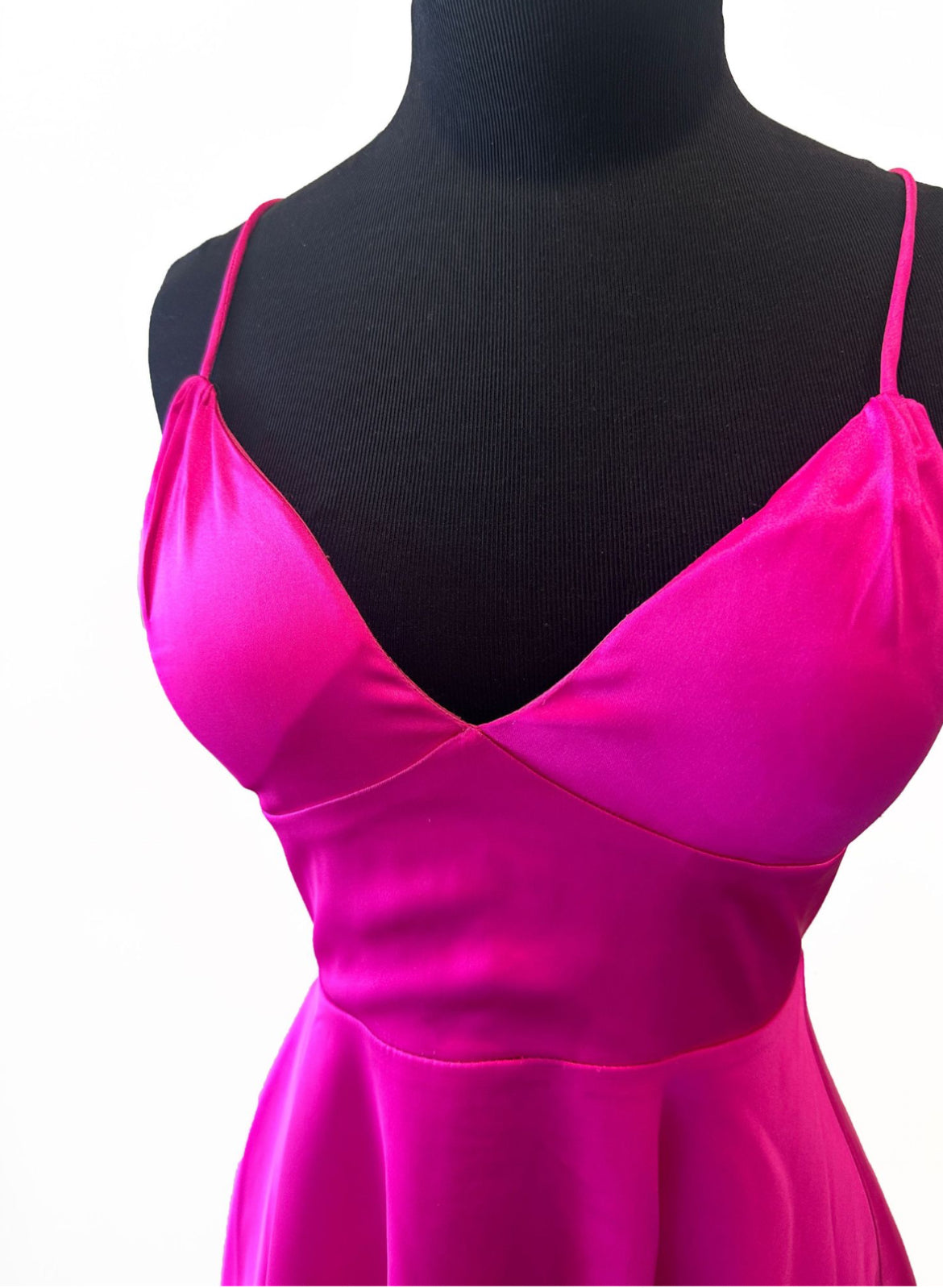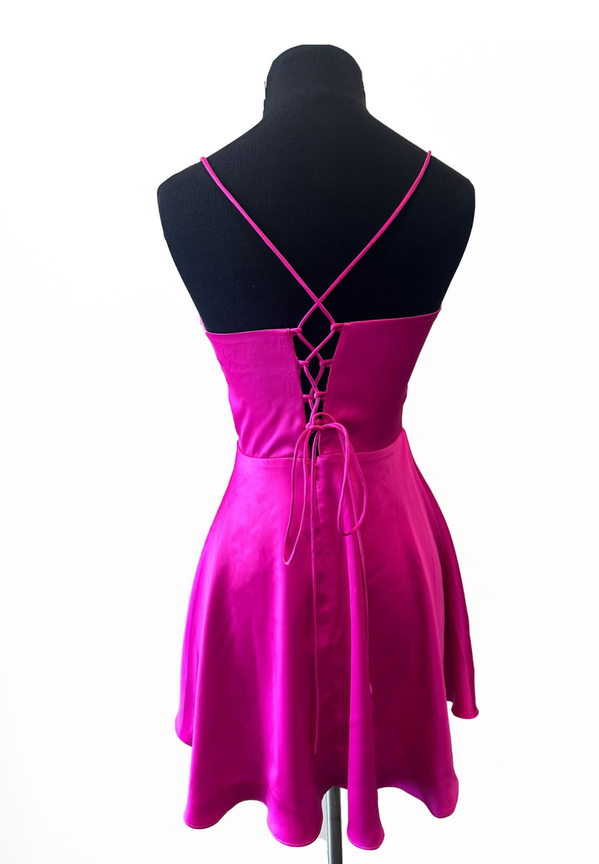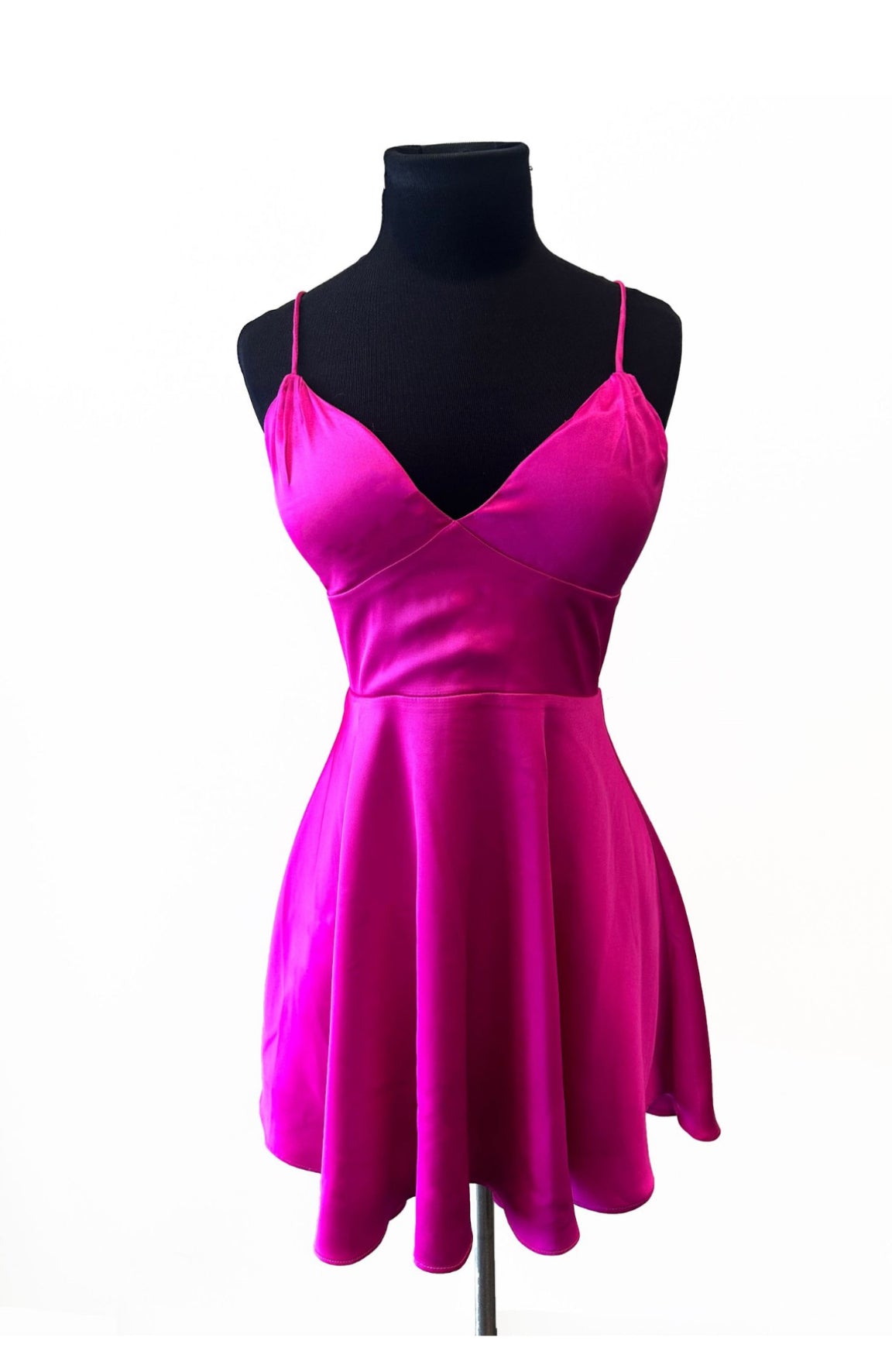 This refined dress showcases a short satin design with delicate spaghetti straps and a V-neckline. Its A-line silhouette flows gracefully from an empire waist, while the lace-up back offers an elegant and adjustable fit.