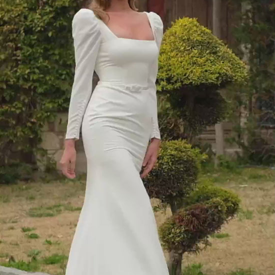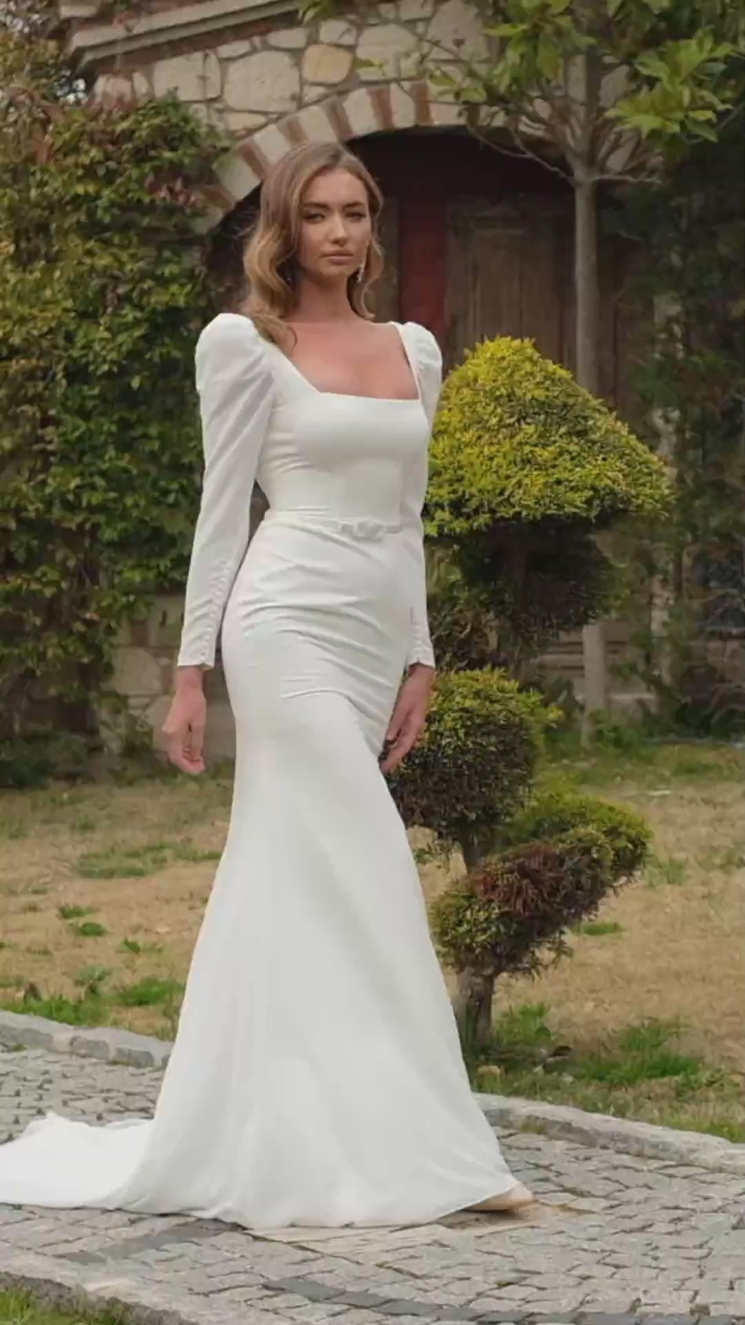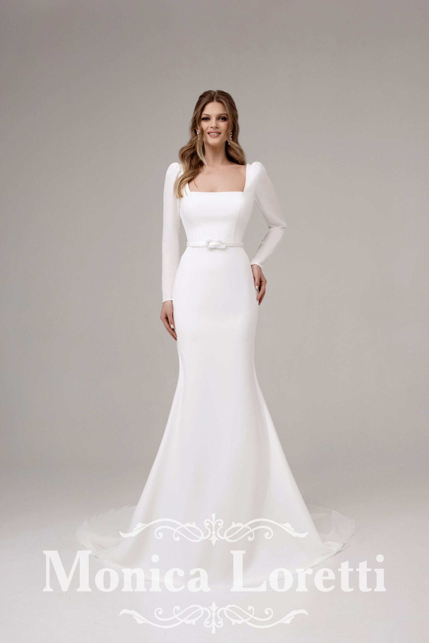 This elegant bridal gown, from the Celeste Collection, features a square neckline and long sleeves adorned with buttons. Its fit-and-flare silhouette complements a low, plunging back, creating a timeless and refined look.