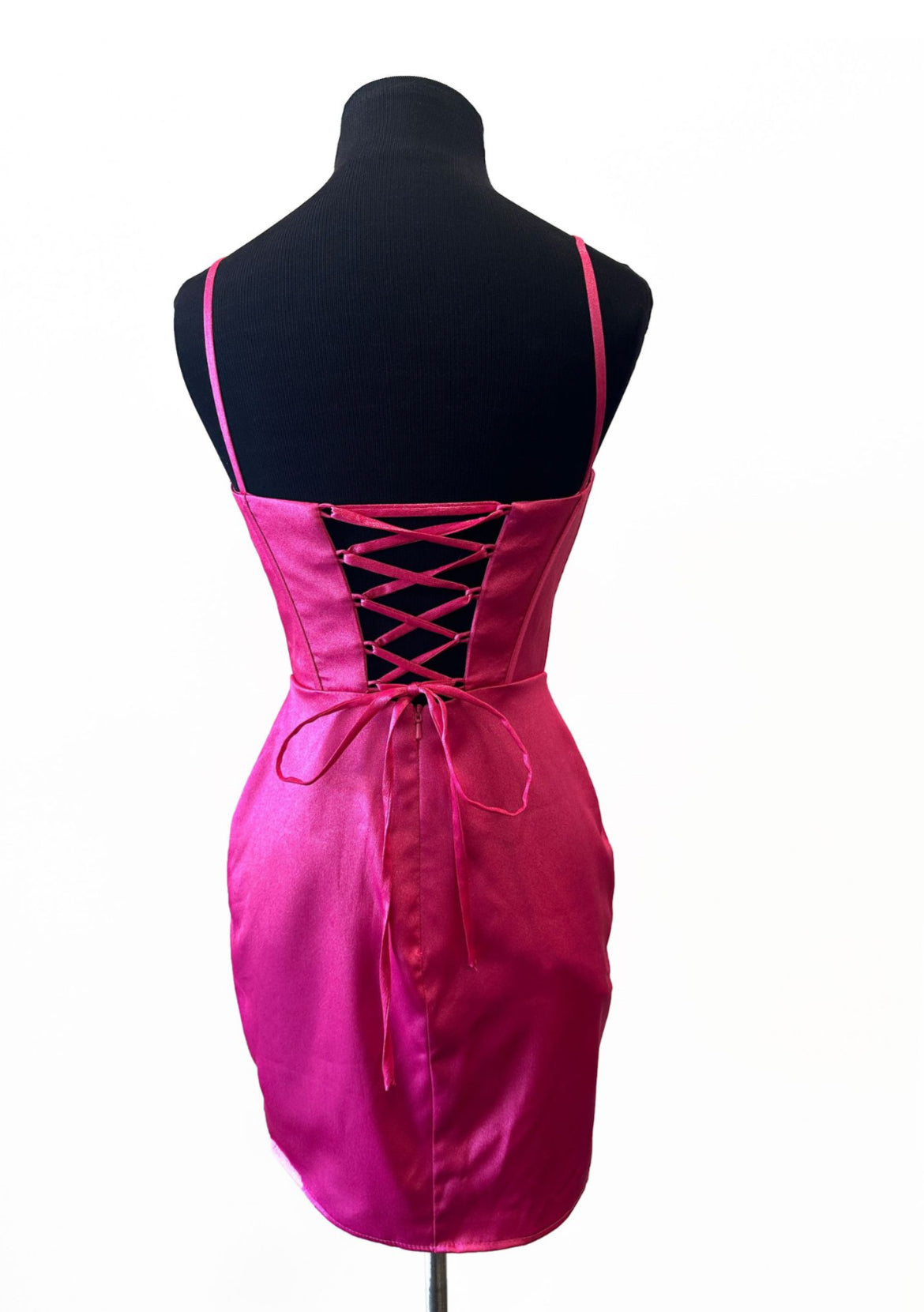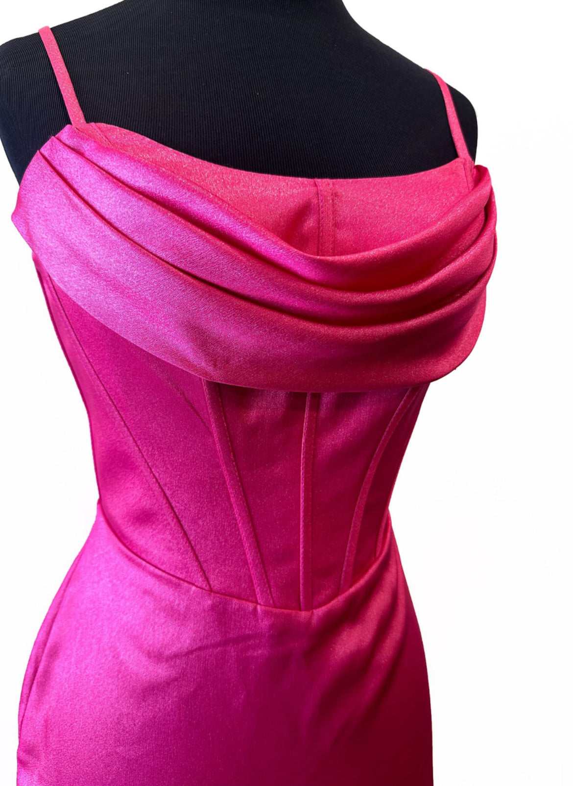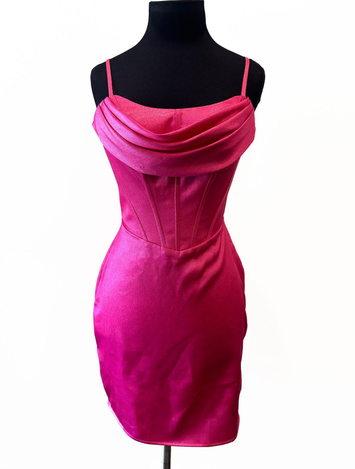 This elegant piece features a short satin design with adjustable spaghetti straps, a corset-style bodice, a graceful cowl neckline, and a sleek sheath silhouette.