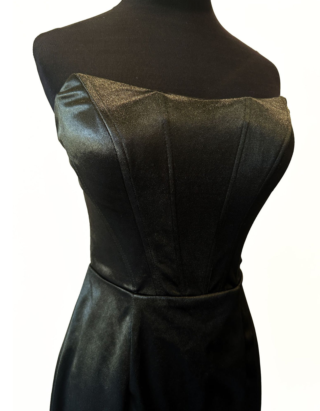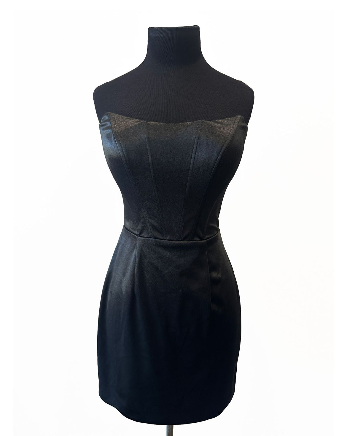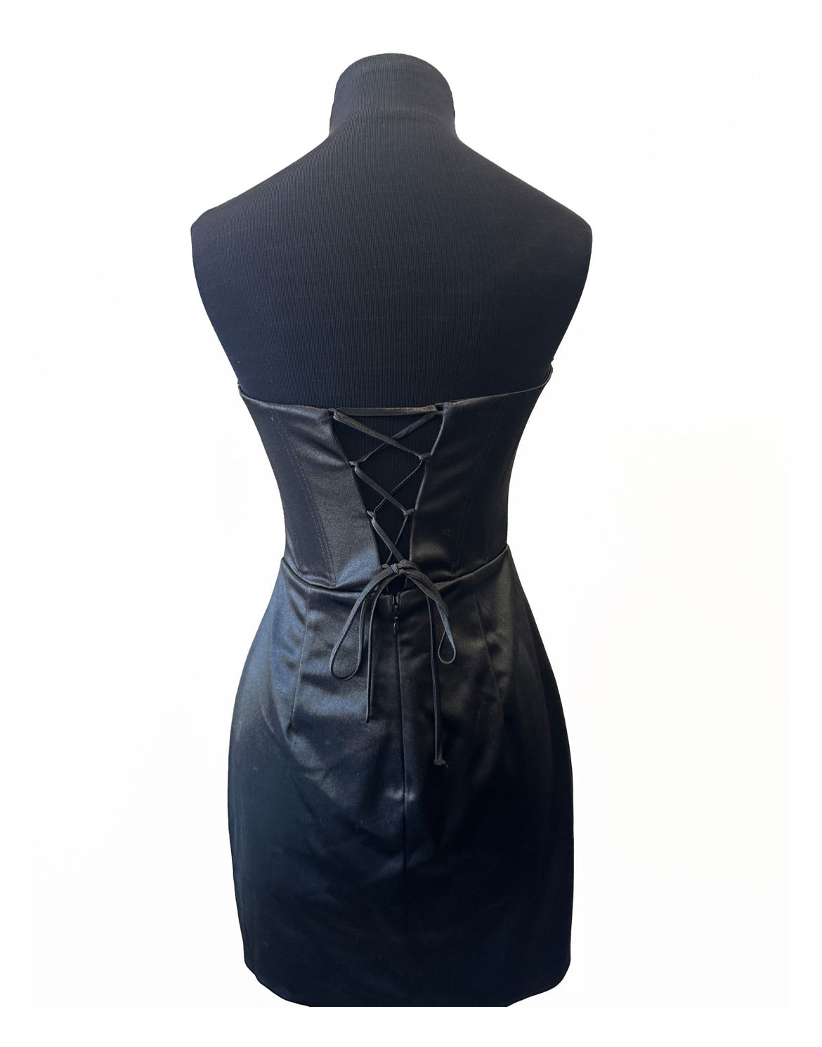 This sophisticated sheath dress is crafted from stretch satin and features a strapless silhouette with a corset bodice and a lace-up back for a perfect fit. Its short length adds a modern touch to the classic design.