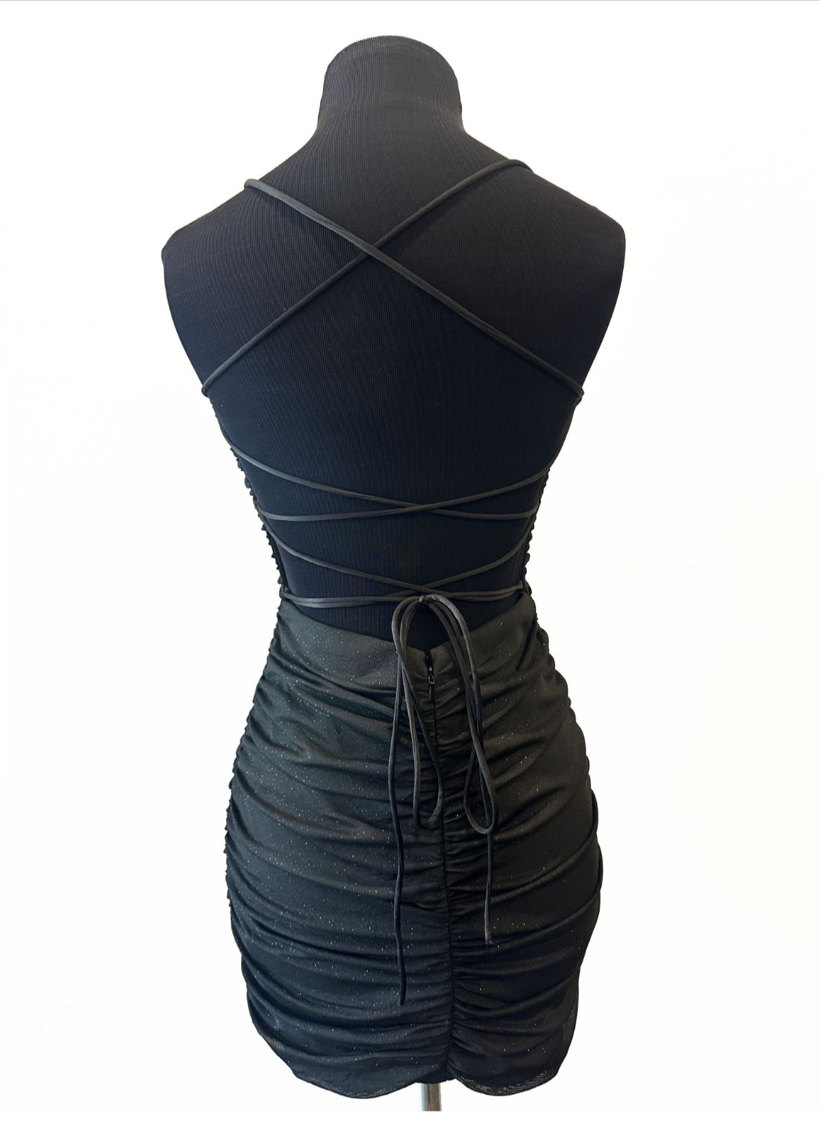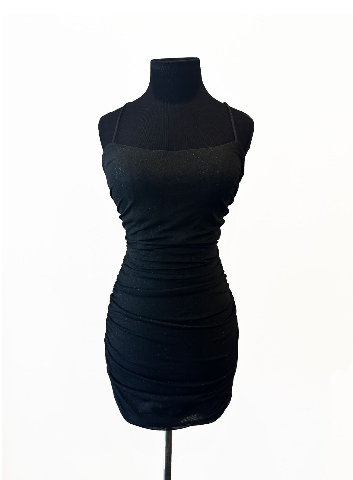 This sophisticated sheath dress is short and fitted, featuring a straight stretch neckline and slender spaghetti straps. It showcases elegant ruching and an open lace-up back, all enhanced by a sparkling glitter mesh overlay.