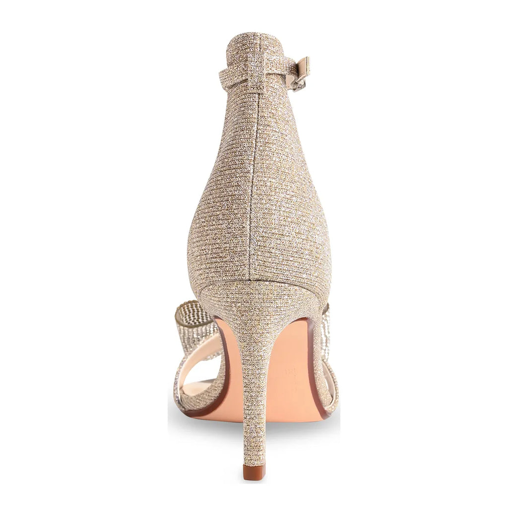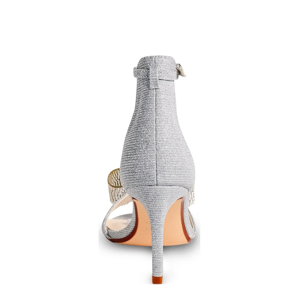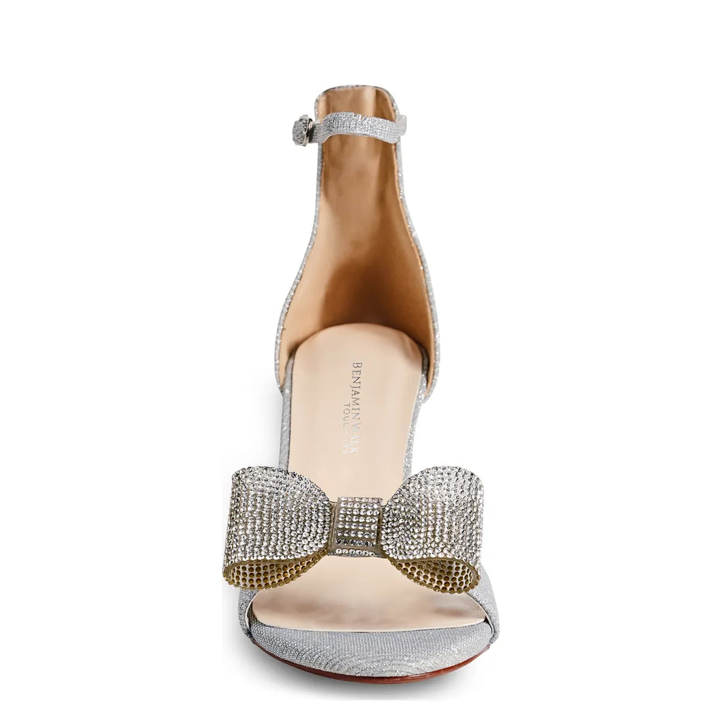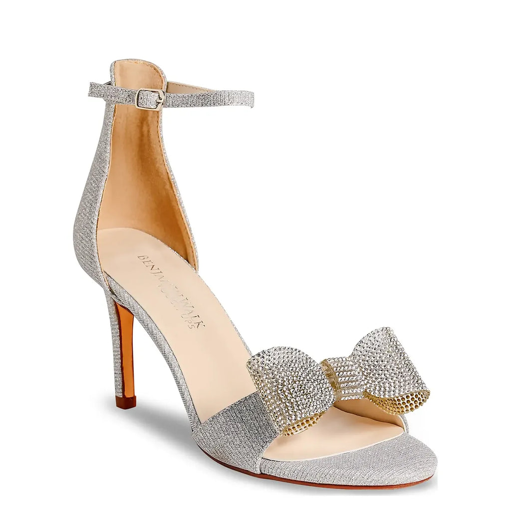 Shine from every angle in the elegant glittery Esme heel by Benjamin Walk. Designed with a sleek ankle strap and a slender stiletto silhouette, this glamorous style is elevated by a statement crystal bow that catches the light with every step. Perfect for weddings, galas, or any night that calls for sparkle, these heels add instant sophistication to any outfit while keeping your look timeless and chic.