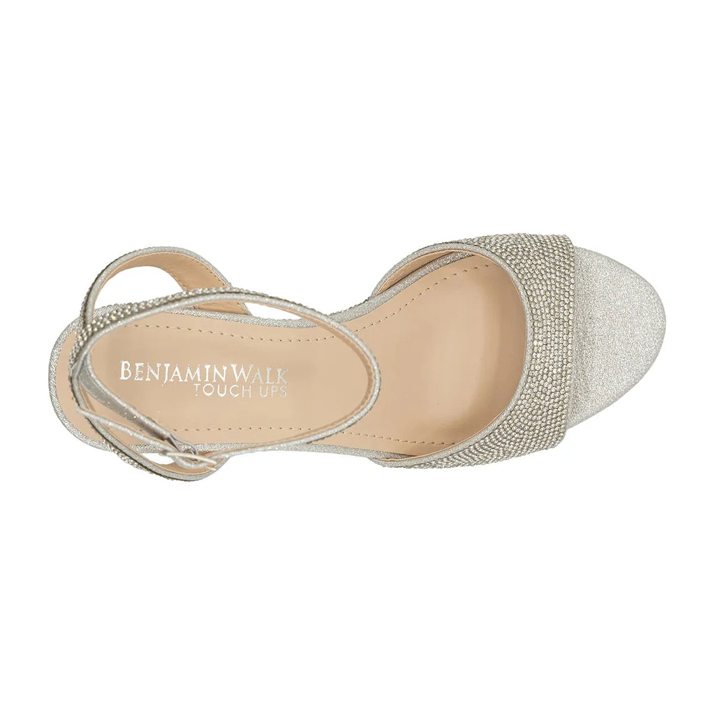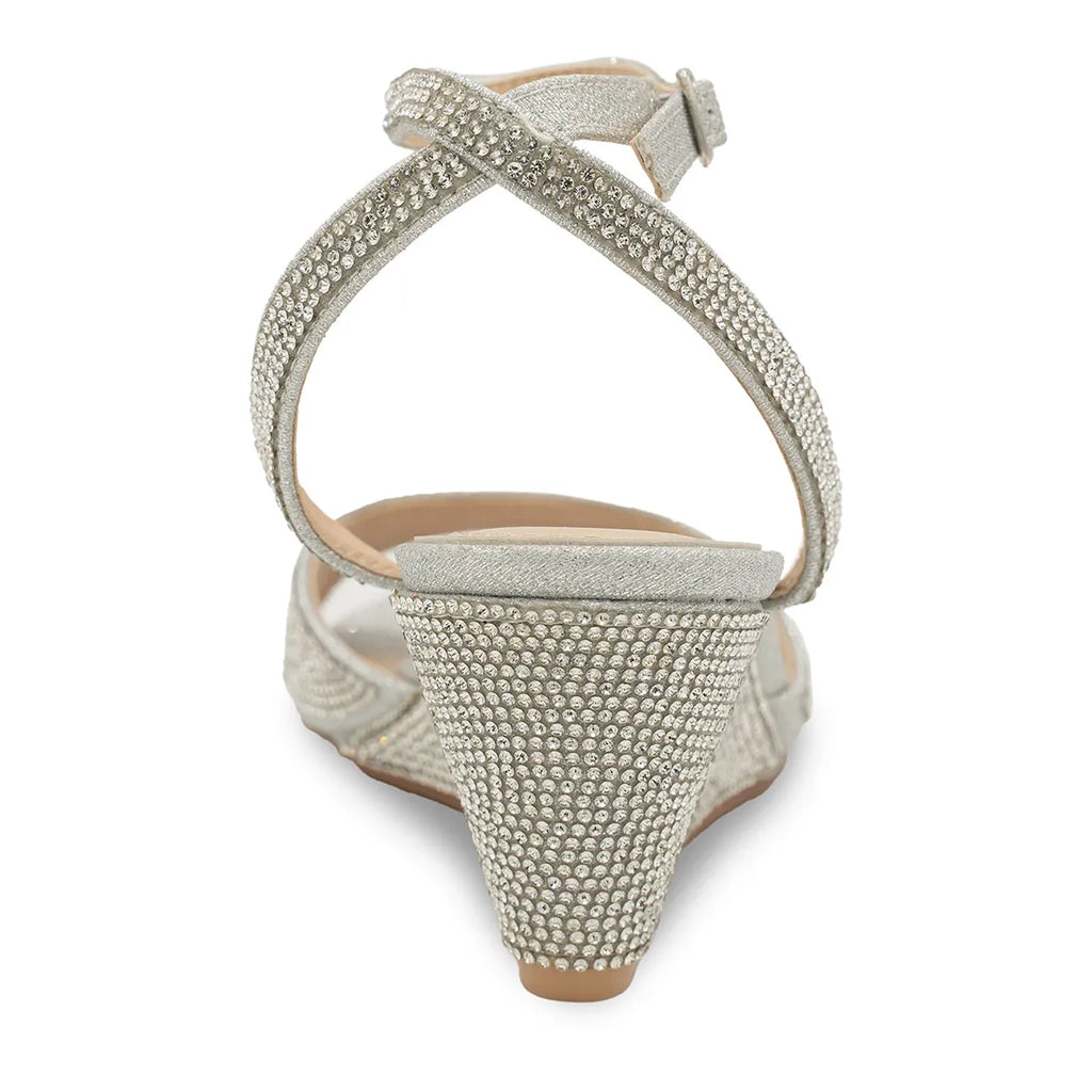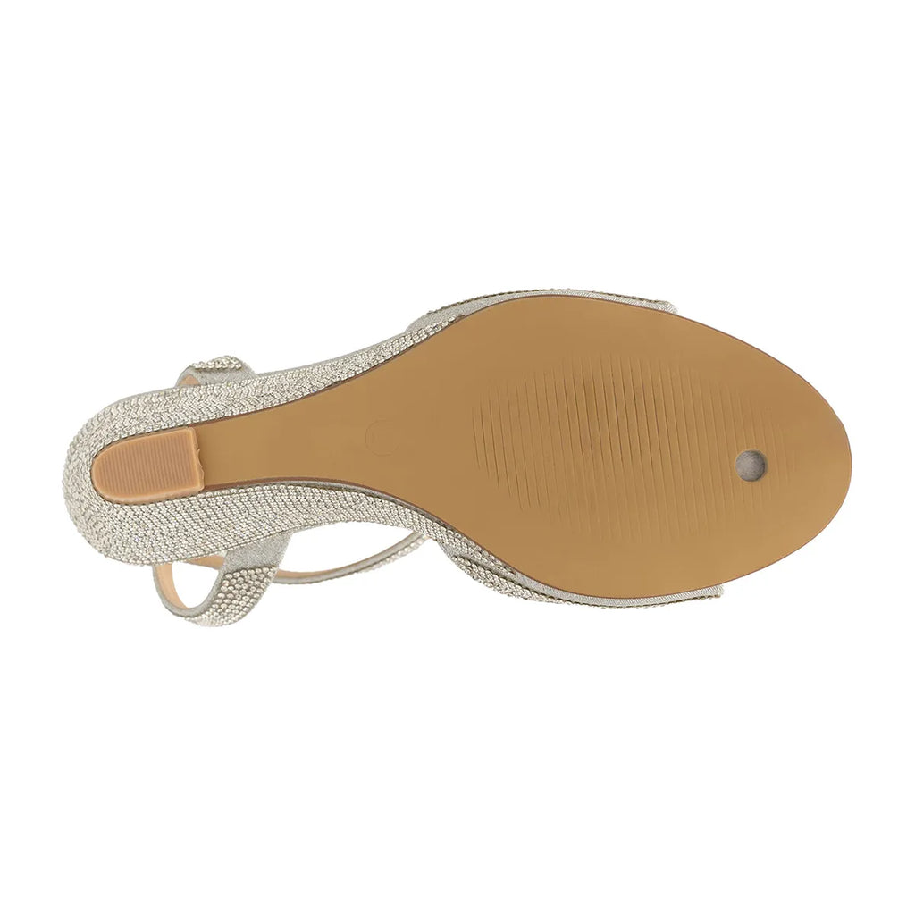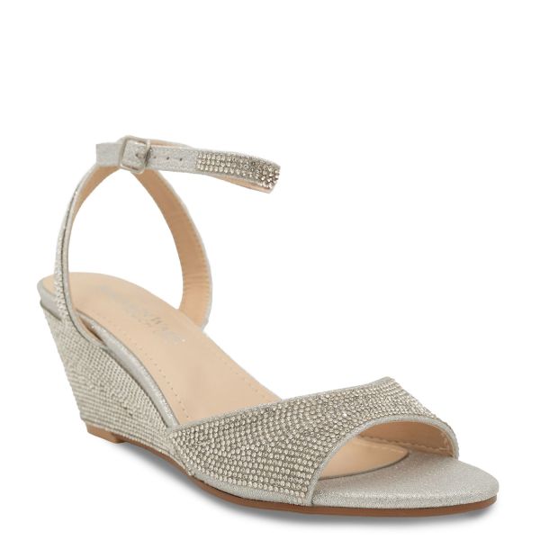 Moxie is a sparkling 2.5" wedge covered in sheets of matching stones. Available in champagne and silver, this shoe is comfortable and easy to wear for the most unforgettable events!